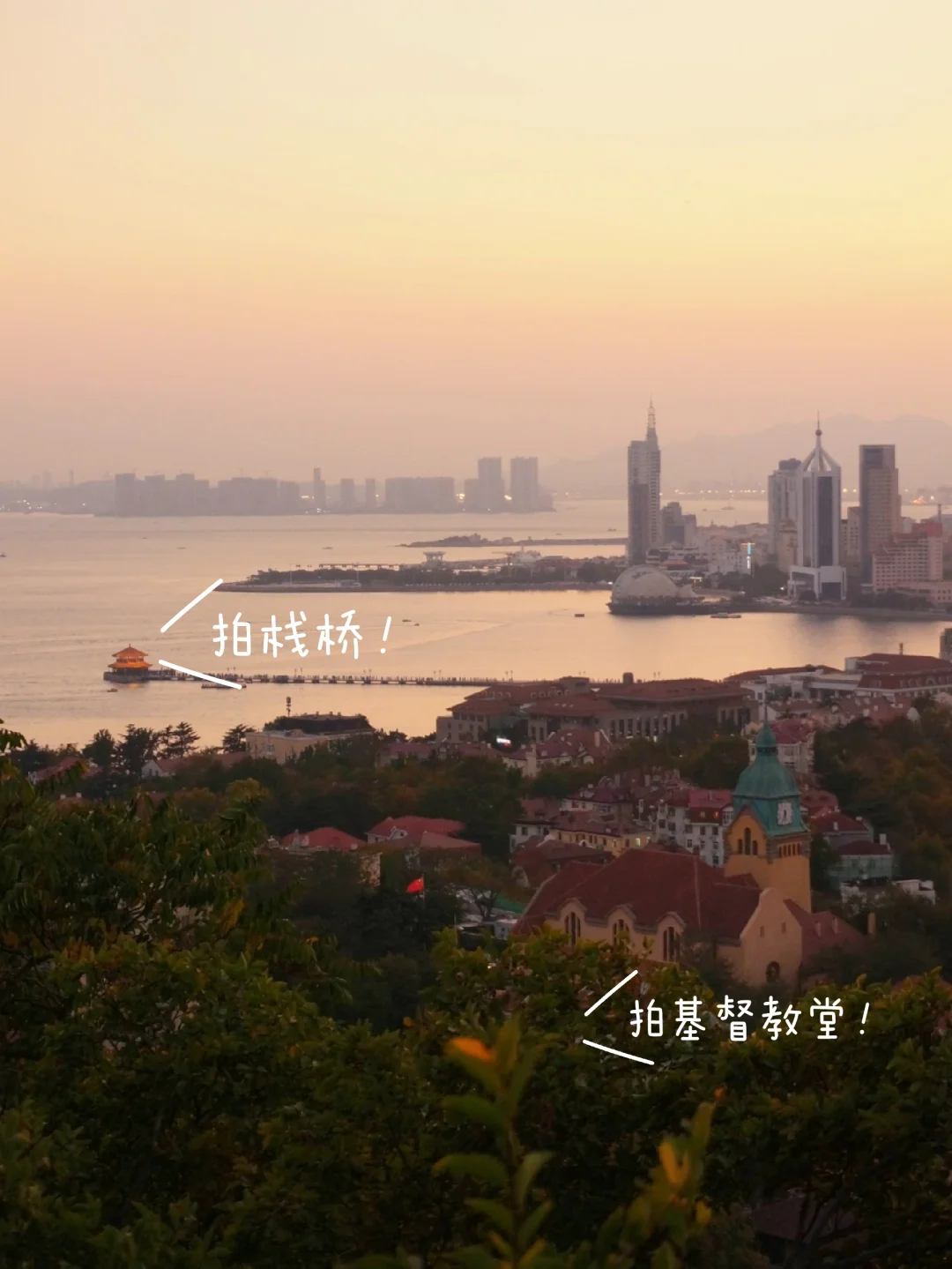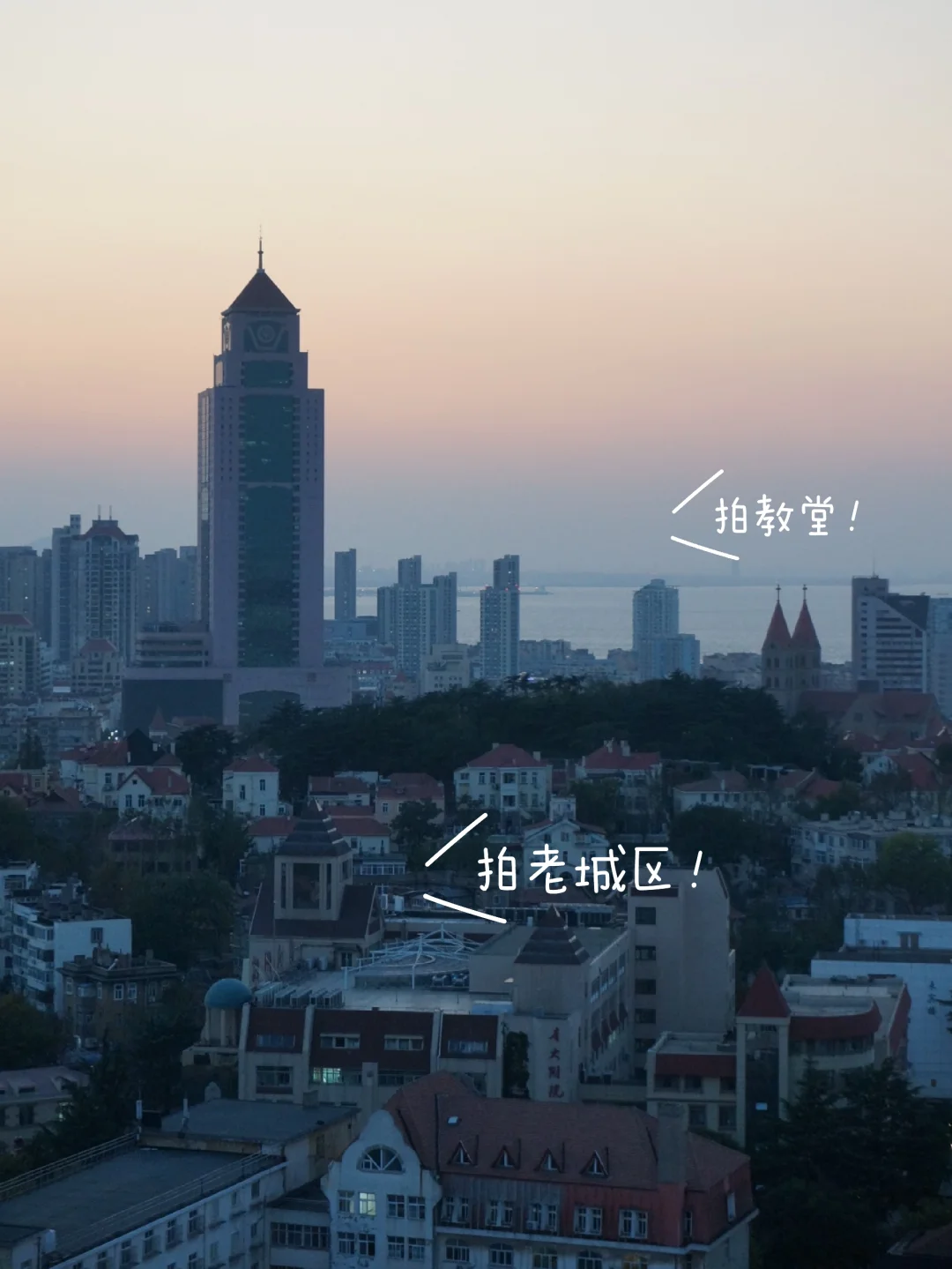 2⃣一定不要错过半山腰德国总督楼(首图)和江苏路基督教堂(图3)的拍摄视角~还可远眺栈桥,教堂,小鱼山,海岸线~