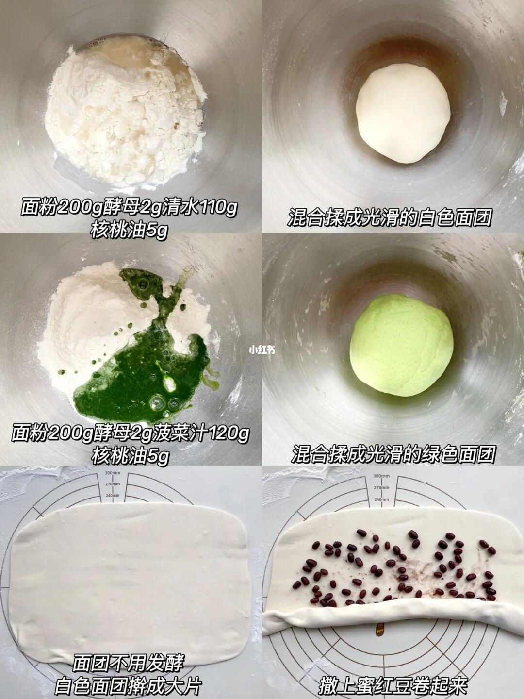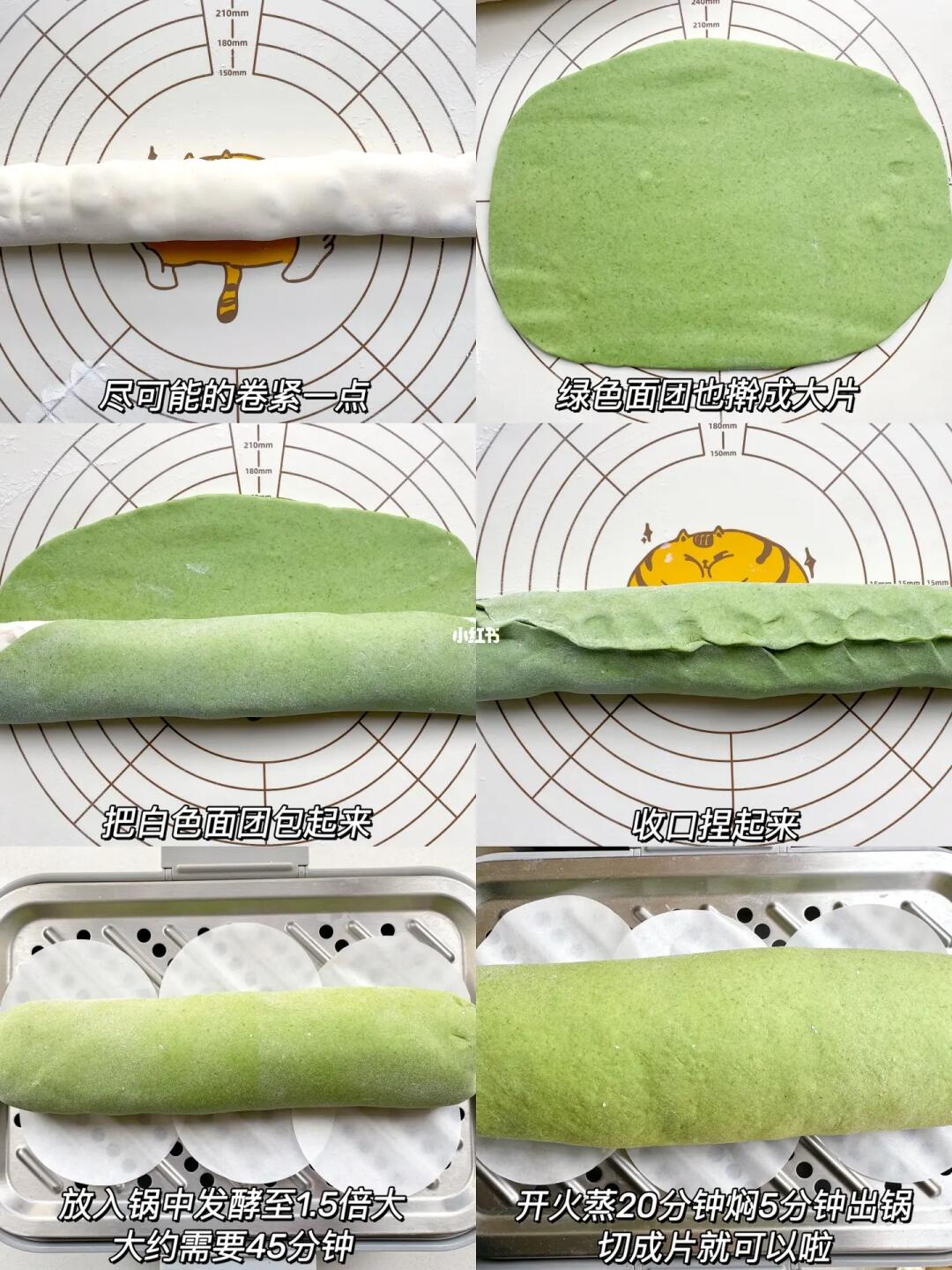 🤍做馒头依旧采用的是一次发酵的方法,节省时间,松软程度也可以。🌟绿色面团和白色面团的比例已经详细的给到了,直接称好克重,按这个比例来,都可以做出成功的馒头哦~