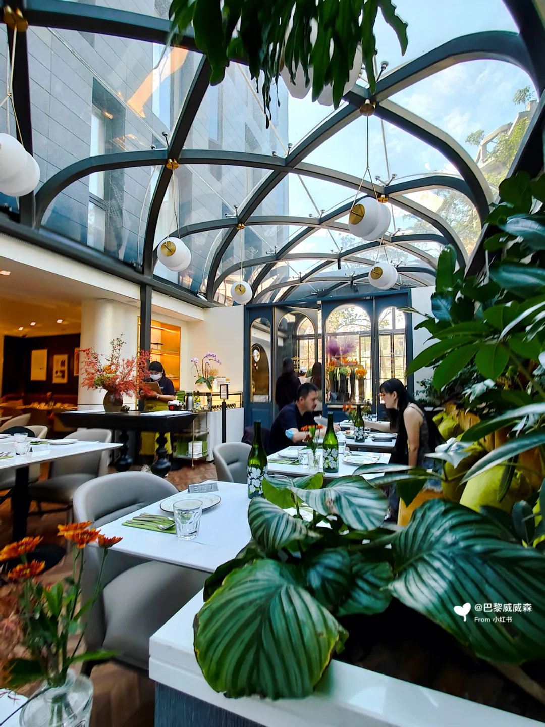 只有坐在他的玻璃房玻璃房的位置才是比较阳光充足的。在上海的夏天或者秋天的时候,在这个地方是用餐,有着非常舒适的绿树环绕,而且还有很多花朵呈现整体感觉,是有那种绿野仙踪的感觉,并且还有vintage质感的大理石设计,