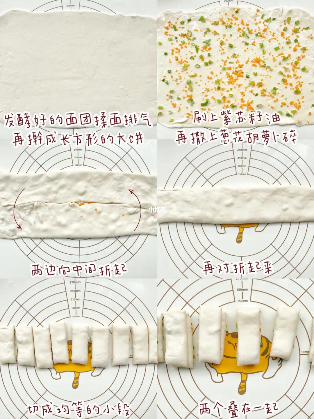 2⃣️发酵好的面团揉面排气,再擀成长方形的大饼。刷一层紫苏籽油,再撒葱花胡萝卜,两边想,中间折起,再对折一下。