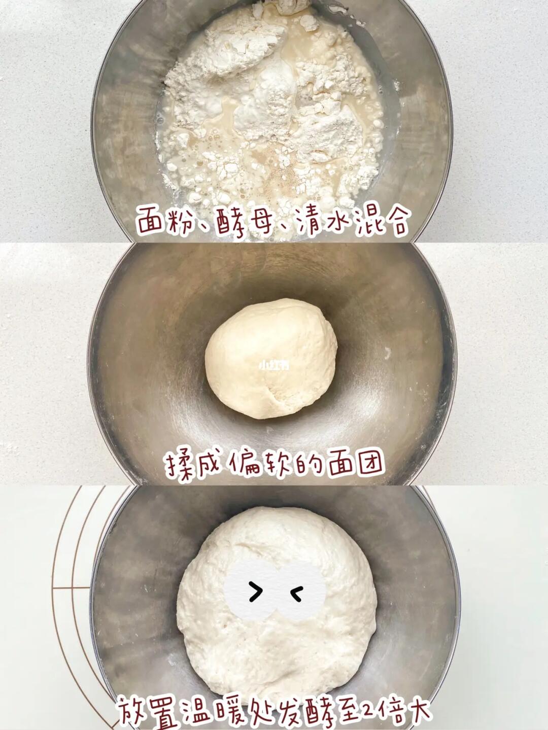 1⃣️面粉、酵母、清水混合揉成团,放置温暖处发酵至2倍大。这样嗯花卷用一次发酵或者两次发酵都可以,一次发酵的话要将面团多揉一会儿,揉到光滑。二次发酵对揉面没有什么要求,对新手更友好一些。