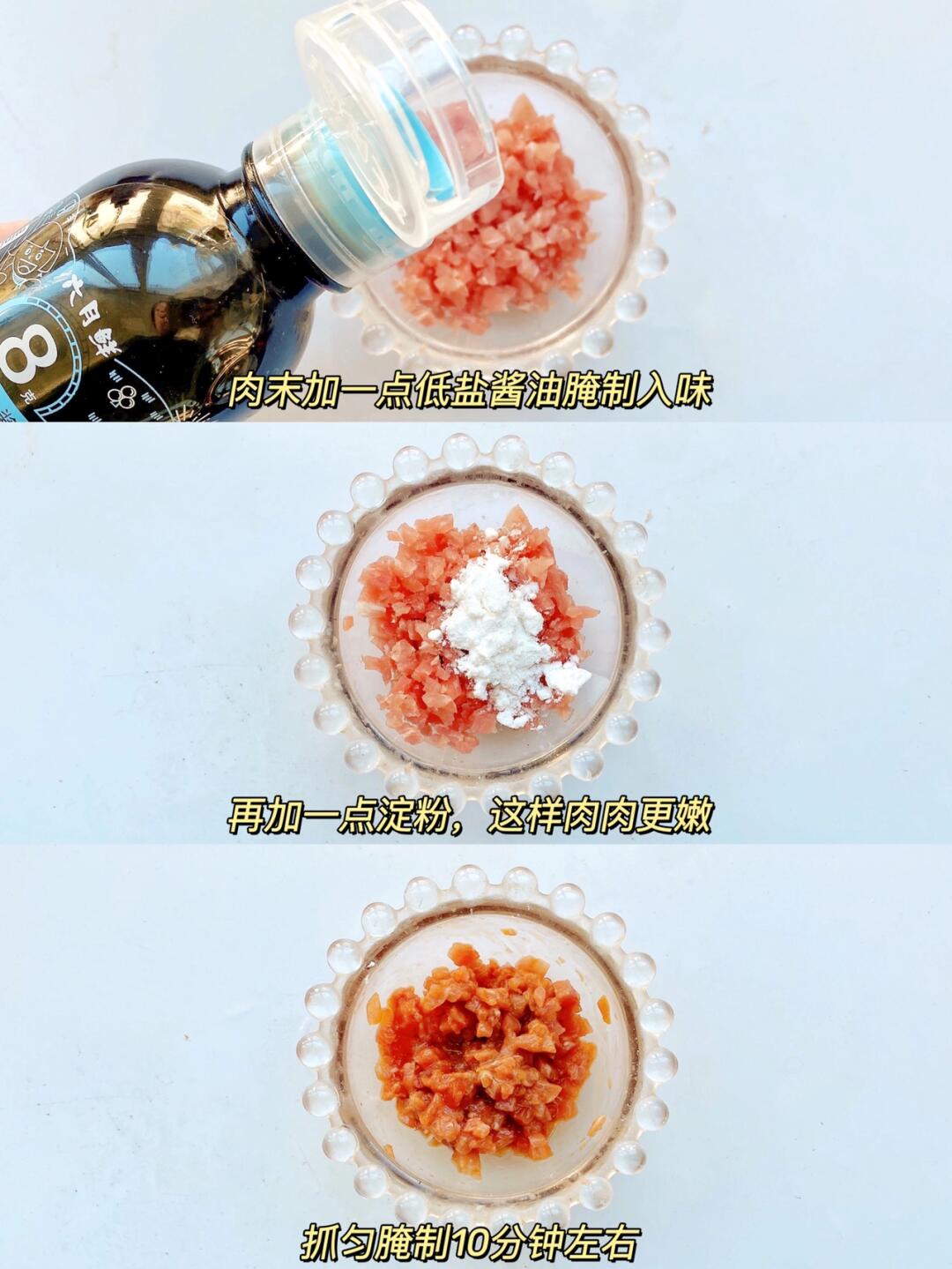 1⃣️猪肉末加一点酱油和淀粉抓匀腌制10分钟,这样肉末会更嫩。