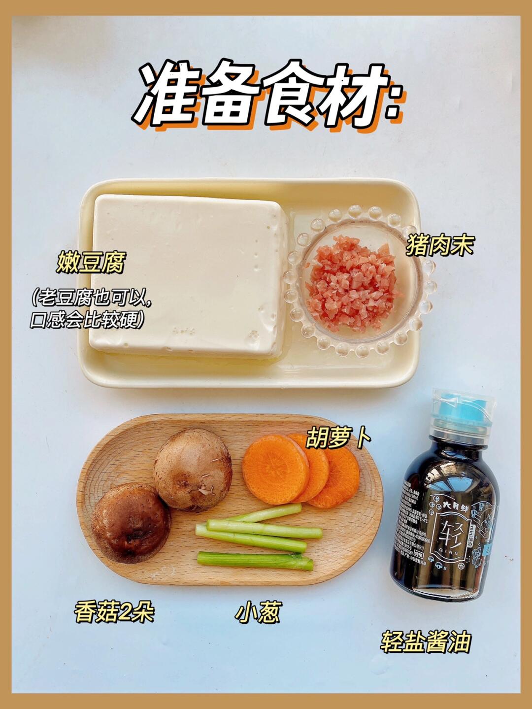 2⃣️腌制肉末的时候将豆腐、香菇、胡萝卜切成小块。