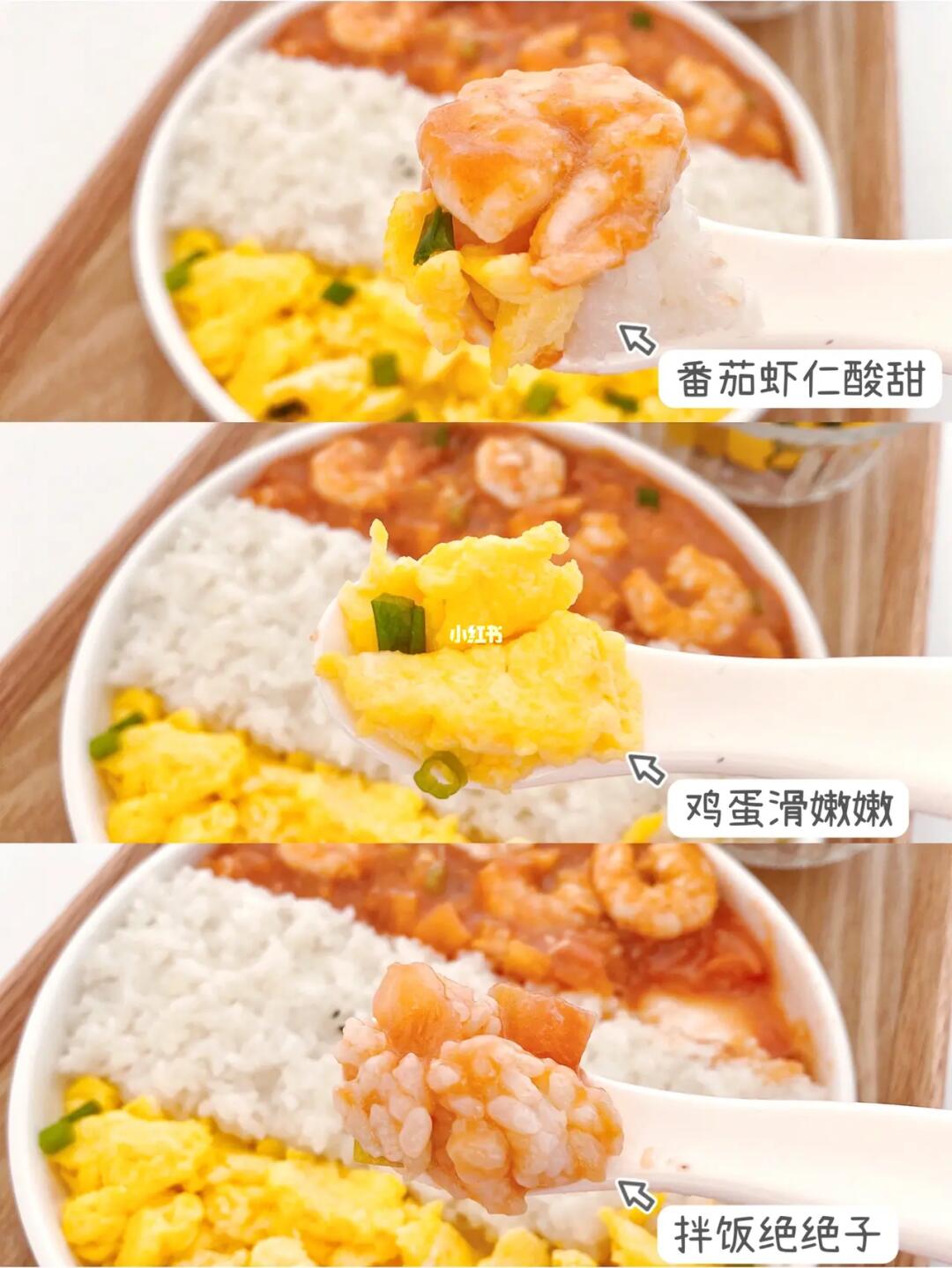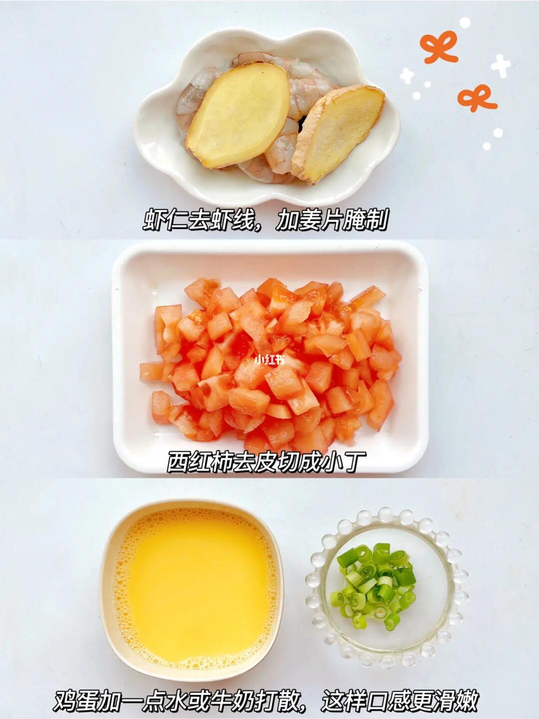 1⃣️虾仁去虾线加姜片腌制去腥。西红柿去皮切成小丁,鸡蛋加一点牛奶打散,这样炒出来口感更嫩。