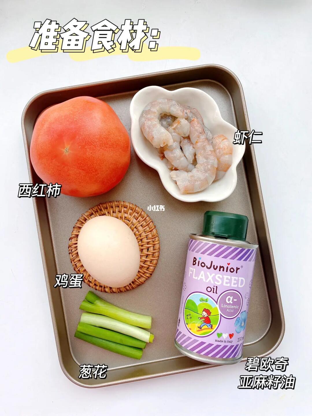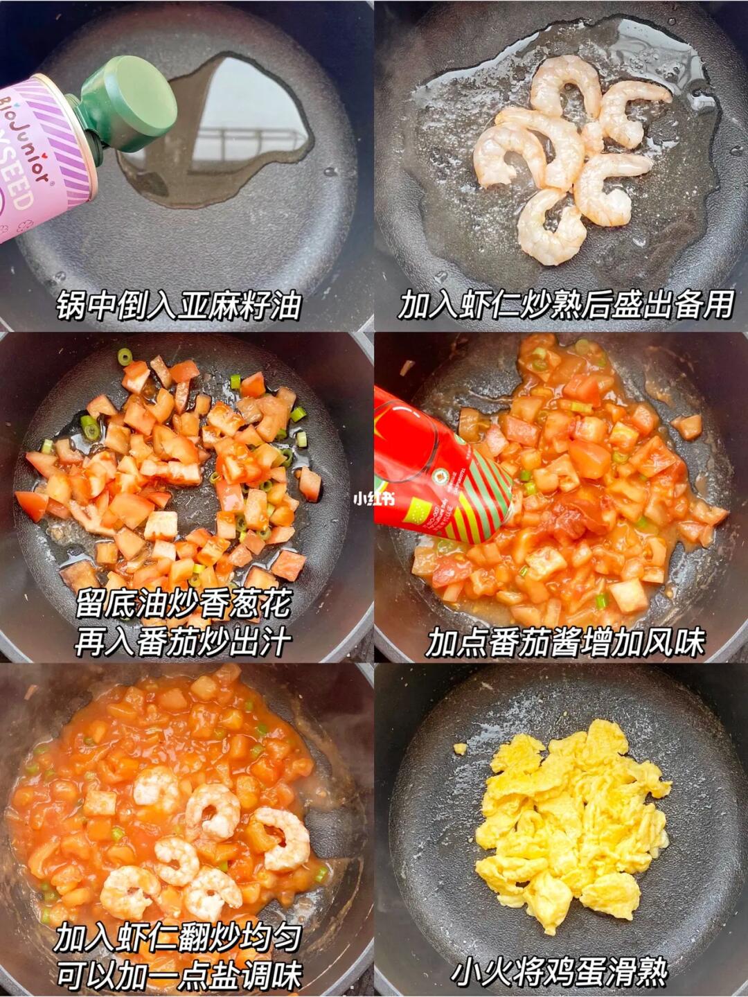 2⃣️锅中倒入亚麻籽油,放入虾仁炒熟后盛出。再加入西红柿翻炒出汁,加一点番茄酱增加番茄味,加入虾仁翻炒,适量盐调味。