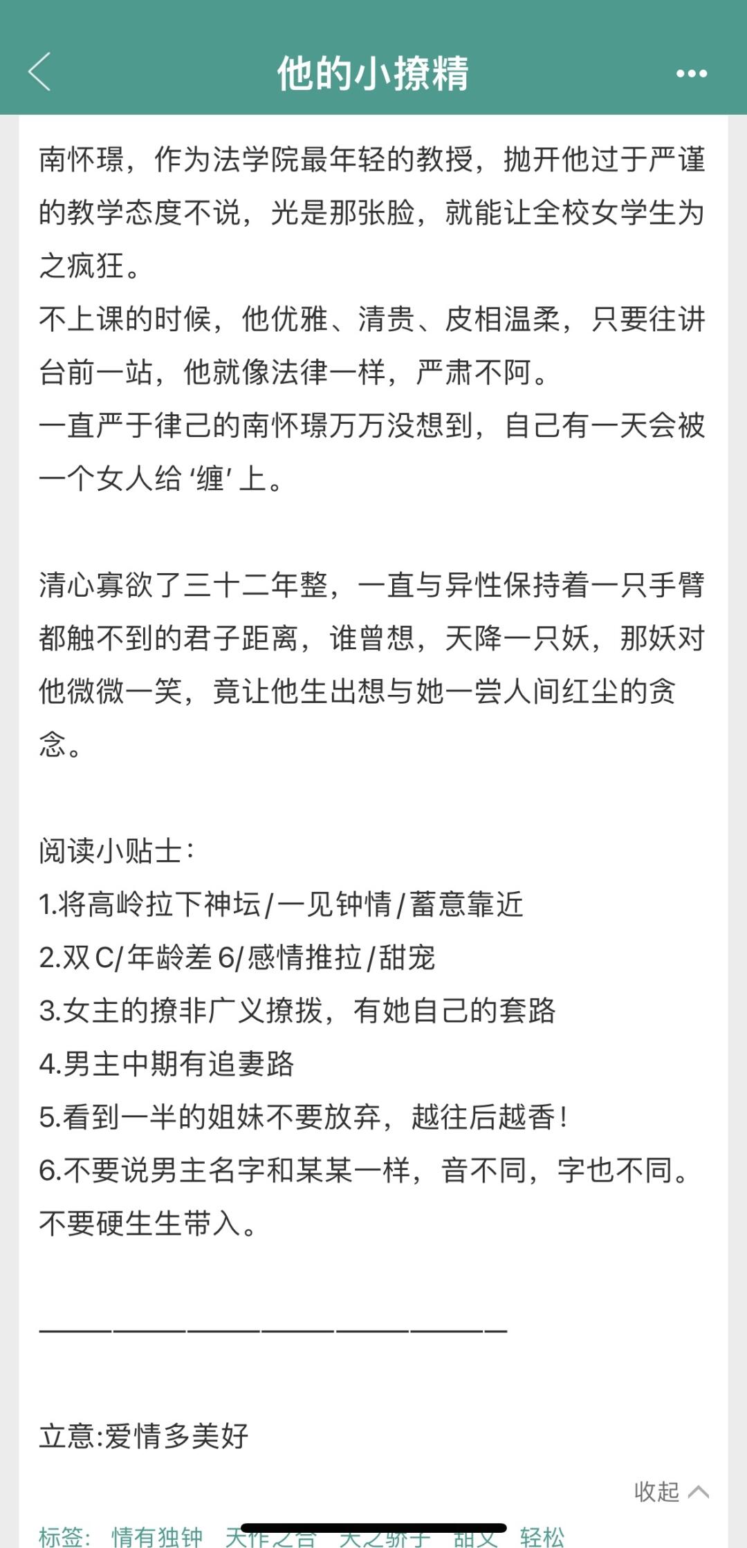 男主:法学系教授 女主:电台主播*插画师 ㅤ 双初恋 女主比男主小六岁 整个一爹系男友!!!看完我想马上谈个恋爱。 ㅤ 前期男主英雄救美女主,女主被男主声音吸引,后来再遇见就开始主动出击。 男主前期还挺矜持 后来以为好兄弟也喜欢女主,有点退缩 但是没几天男主就忍不了了还是疯狂追妻 ㅤ 后面在一起了真的是好甜好甜好甜还不腻的那种 喜欢爹系男友的有福了 这本我看了三遍,过段时间准备再看一遍,每一次都会被男主的宠溺打动 不看就后悔去吧!!!