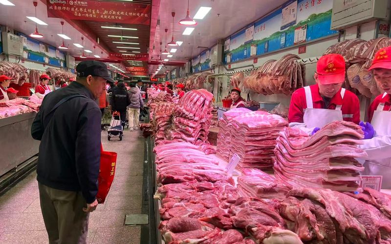 消费者正在挑选猪肉。新京报记者陈琳摄