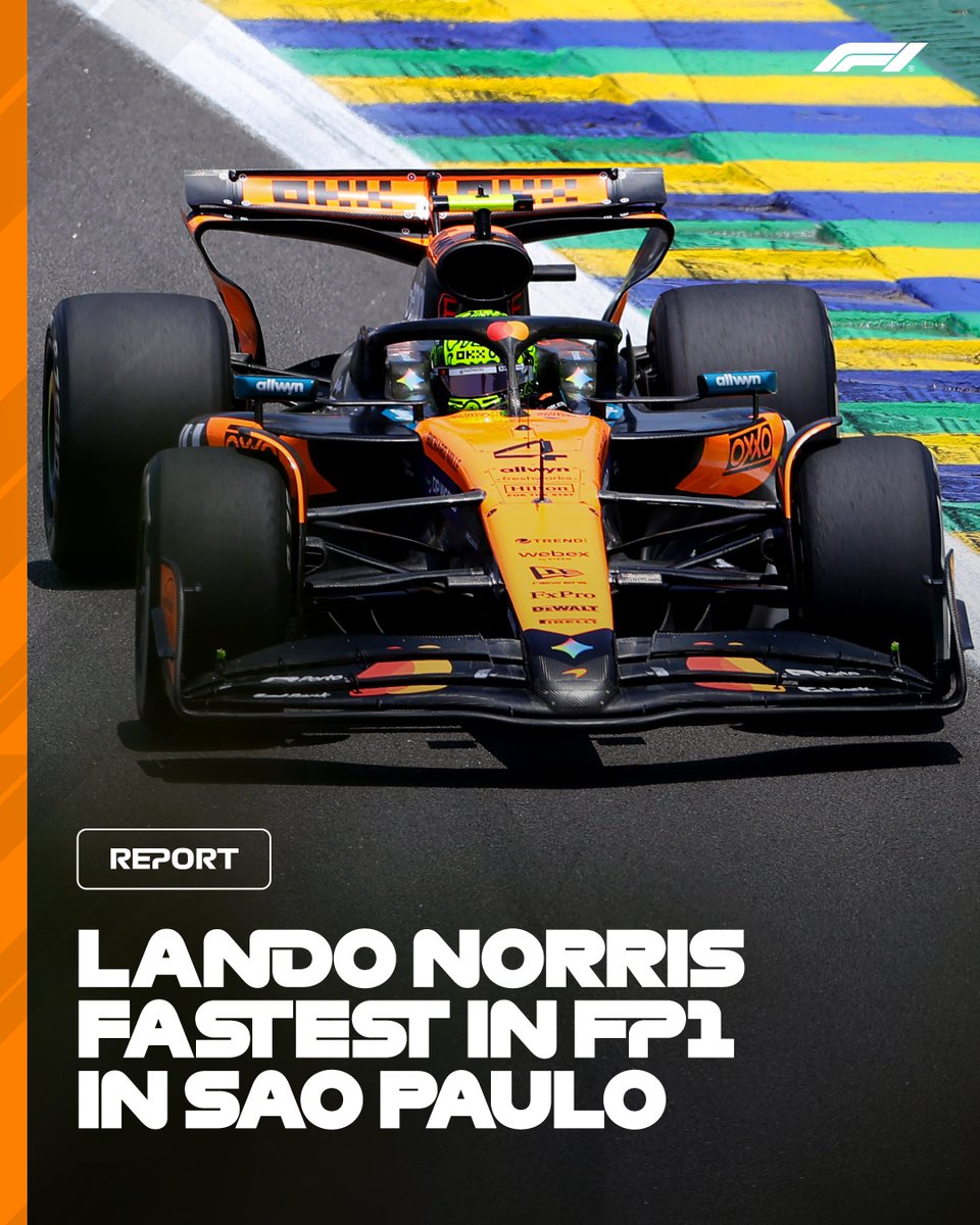 F1官方推特账号报道。兰多·诺里斯在英特拉格斯赛道的第一节自由练习赛中领先队友奥斯卡·皮亚斯特里位列第一完整详情#F1#巴西大奖赛