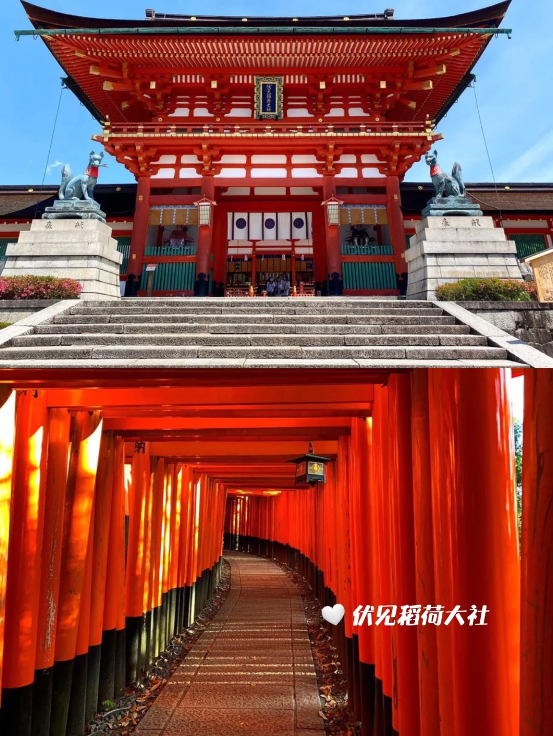 ②京都·伏见稻荷大社:供奉着保佑五谷丰登、生意兴隆的稻荷大神。通往稻荷山的朱红色鸟居⛩色泽亮丽,看似无穷无尽,是日本最著名的景观之一。