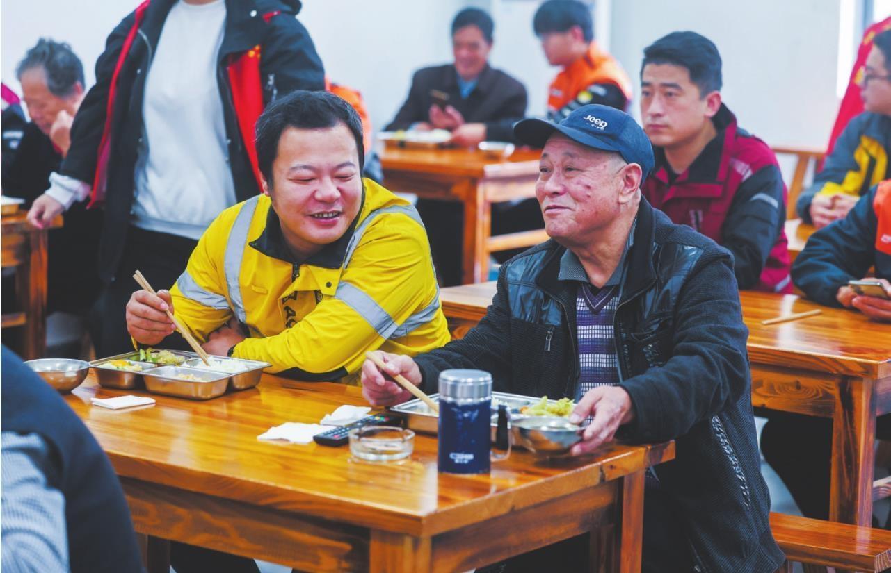 近年来,浙江省诸暨市陶朱街道深化党建引领基层治理、推动新就业群体融入城市基层治理体系,通过打造快递员、外卖员的“暖心驿站”和“小哥志愿服务队”,增强他们对城市的归属感、认同感。图为11月7日,在陶朱街道祥云社区爱心食堂内,外卖员与食堂里就餐的老人聊天。