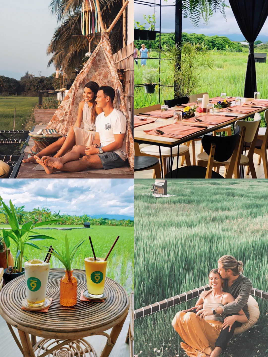 🔹室外稻田处还有镂空的吊床,可以在上面躺着发呆也是一种不错的选择,除了吊床还有躺椅、遮阳伞等座位,想怎么躺都行~