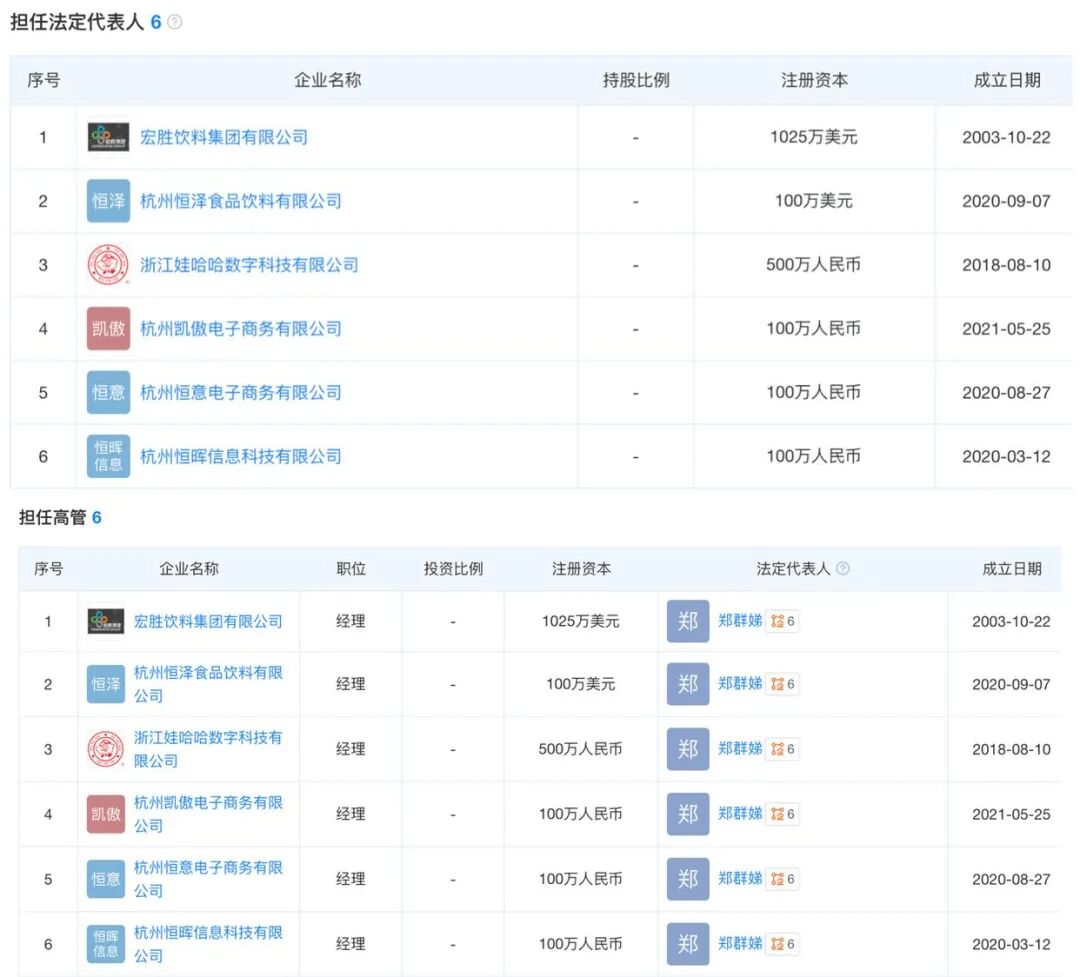 天眼查信息显示,郑群娣共在6家娃哈哈相关公司担任法定代表人,包括宏胜饮料集团和杭州恒泽食品饮料有限公司、杭州恒意电子商务有限公司等4家宏胜系公司,以及浙江娃哈哈数字科技有限公司法定代表人,该公司股权穿透后,实控人为宗馥莉。