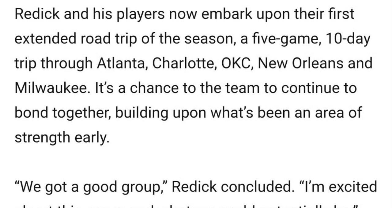 湖人队记Mike Trudell 对雷迪克进行专访,后者谈到本赛季球队开局7胜2负的原因。 “我觉得关键在于我们的心态。在NBA,如果你踏上赛场却不坚信自己能赢,那就不可能取胜,而我们的球员从一开始就有这种信念。周二对阵开拓者的比赛,他们那种自信、坚定的信念以及真正的团队凝聚力,看得人热血沸腾,完全展现了出来。 “我们的战术体系有一定的连贯性,我们简化了打法,明确了每个战术的细节和时机。而且我们的进攻拼劲非常棒,战术执行力越来越好: 从防守到进攻的转换、快攻,在进攻拼劲和战术执行之间找到平衡。 “我们拥有一支很棒的队伍,我对这支球队及其潜力感到兴奋。”
