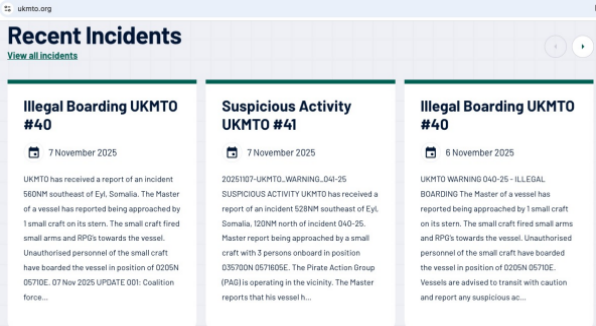 报道称,该地区已出现两起海盗登船未遂事件。此前11月3日凌晨,4名海盗在一艘小船上向化学品船“StoltSagaland”轮开火。
