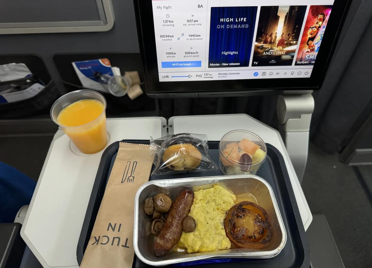 BA169伦敦-上海 第一次打卡英国航空公司的班机 ✈️机型是777-200 全程飞行时间12小时28分钟 全程有wifi 飞行前24小时线上值机 选了第一排的座位 腿脚可伸直 飞机起飞后约1.5个小时开始发餐食(见图4 ) 个人觉得挺好吃的 是chicken rice 另一个选择是pasta ⚠️ 不过 下一顿就是在10小时后了 English breakfast(图6) 美中不足的是份量太少 吃完肚子还是饿 [捂脸] 总体体验不错 飞机的内饰 安全视频都很英国[赞] 英国航空