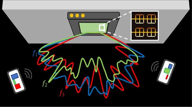 为验证这一原理,研究团队采用由美国洛斯阿拉莫斯国家实验室与桑迪亚国家实验室合作制造的一种超薄电子表面——超表面(metasurface)。当宽频信号照射其上时,会被散射成依赖于信号方向与频率的独特图案。每个方向都会形成一种专属“电磁指纹”,接收端可将其实时比对预先记录的信号库,以快速确定信号来源;整个过程仅需数皮秒(即万亿分之一秒)。