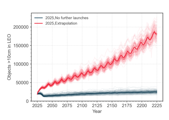 《2025年太空环境报告》针对未来地球轨道上发生灾难性碰撞的次数预测图。图表