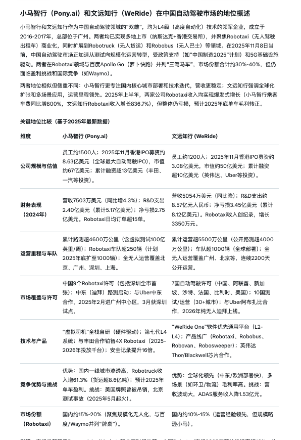 3,小马智行(Pony.ai)和文远知行(WeRide)作为总部位于广州的自动驾驶“双雄”,在本土市场尤其是广州形成了直接而激烈的竞争格局。但两者高管间偶有“对峙”(如小马CTO称文远落后两年半,文远CFO反击安全问题),反映激烈竞争,而二公司同时在香港IPO之前,这次是文远先发起了正面进攻。