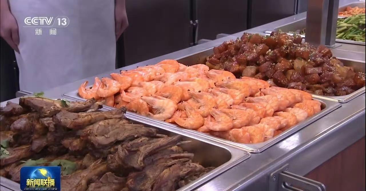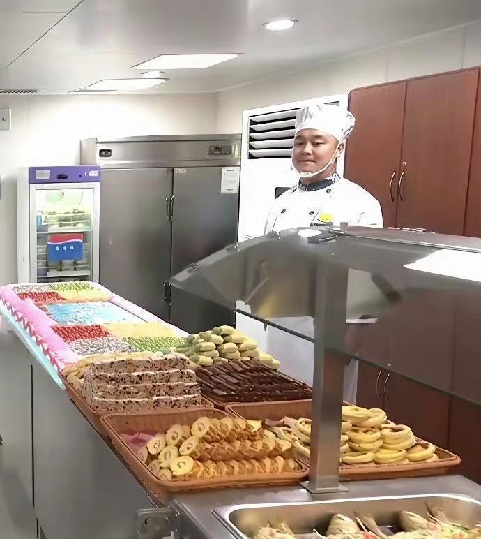 昨天看了福建舰的伙食,荤菜有羊排,大虾,红烧肉,蒜薹炒肉,西红柿炒鸡蛋,蒸鱼。另外还有些饭后水果跟甜点。其中有个超大水果蛋糕。 不过这一次我发现,没有把素菜给拍进去,好像只是一扫而过,没细拍。我就是不知道,福建舰餐厅的冰箱里,放的是什么饮料呢? 我也想起了今年夏天山东舰在港岛开放参观时,舰上的炊事班开始做饭了,饭菜飘出的香味,直接馋到了正在舰上参观的港岛市民。