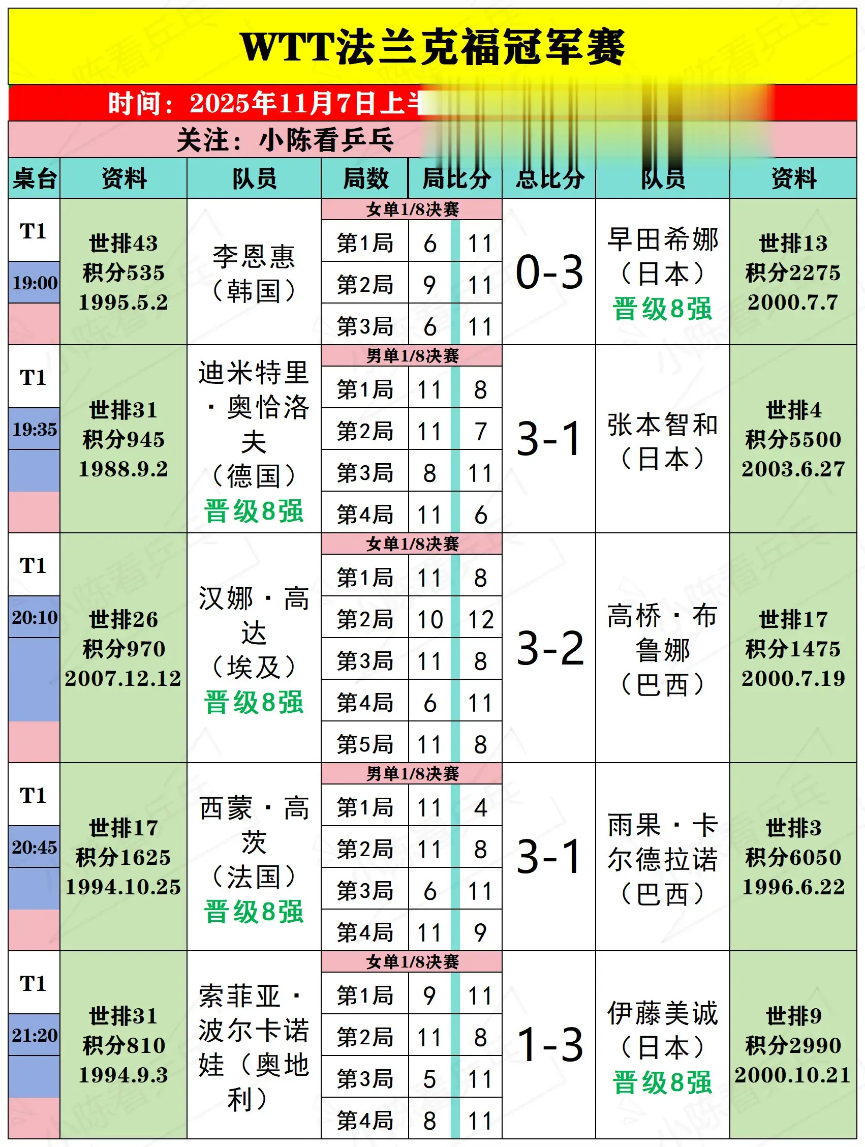WTT法兰克福冠军赛11月7日上半场赛况。WTT法兰克福冠军赛11月7日上半场赛况,男女单打1/8决赛,奥恰洛夫3-1张本智和,汉娜·高达3-2高桥·布鲁娜,西蒙·高茨3-1雨果·卡尔德拉诺,男单1/2/3号种子均出局。