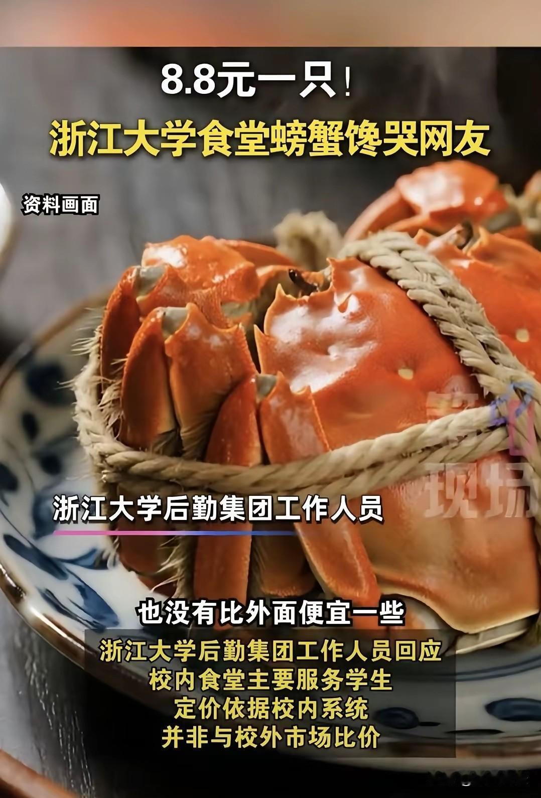 两所985大学因螃蟹“杠上”,十分有趣。南京大学食堂推出999元一只的帝王蟹,还免加工费。这只帝王蟹4.2斤,价格低于市场价,还有波士顿龙虾、石斑鱼等菜品。不过,有人质疑高校食堂卖高价菜。好在南大一直有保供稳价举措,涉事窗口是在进行服务升级和菜品测试。 反观浙江大学,湖蟹仅售8.8元,主打亲民路线。学生既能在南大体验奢华,又能在浙大享受实惠。两所大学食堂各有千秋,能满足不同学生的需求。