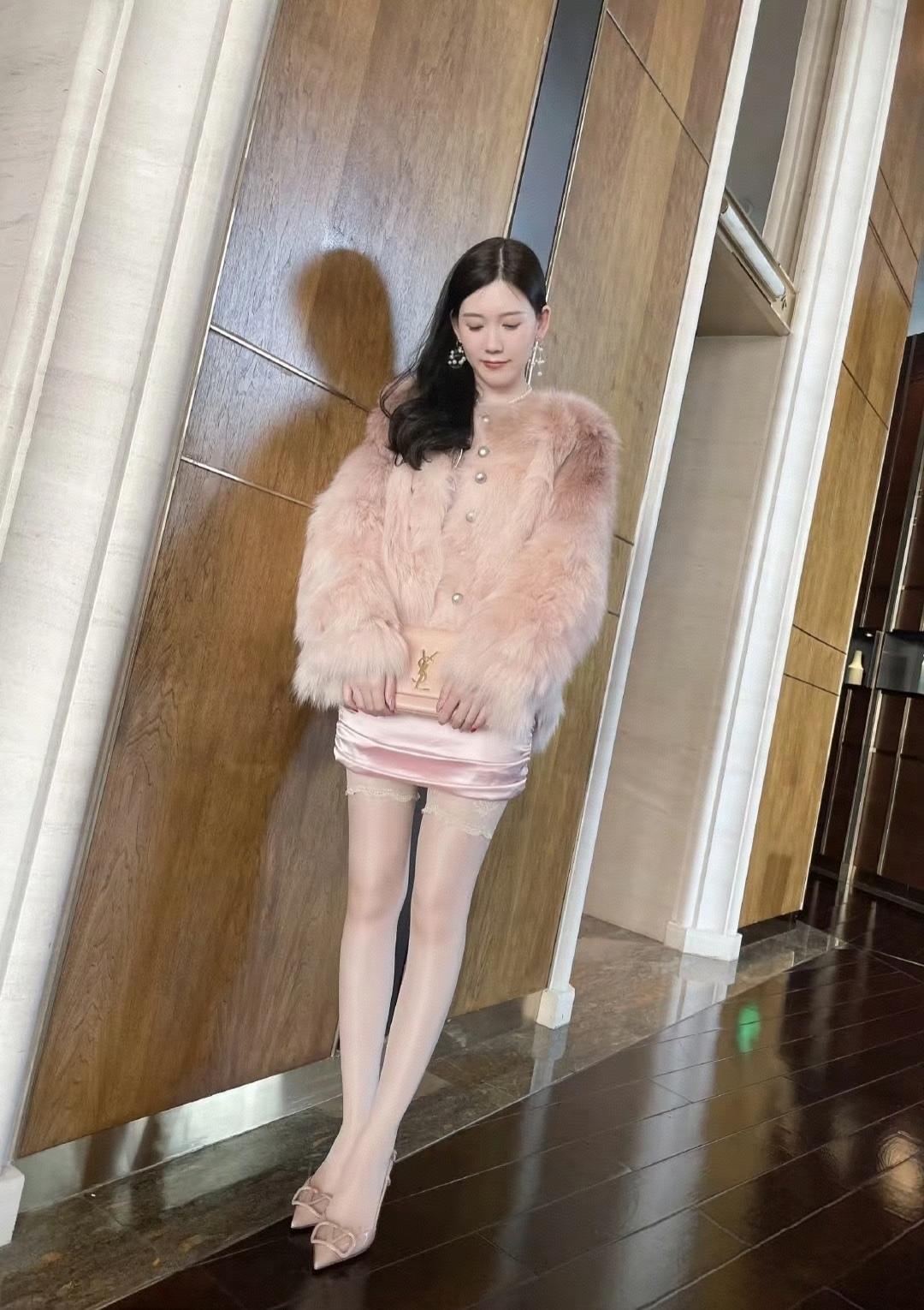 浅灰蓝西装套装,干练又优雅,搭配粉色链条包,精致中带着温柔,轻松穿出职场与日常的