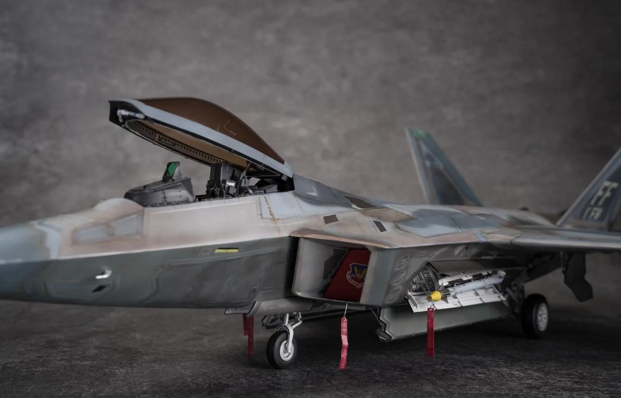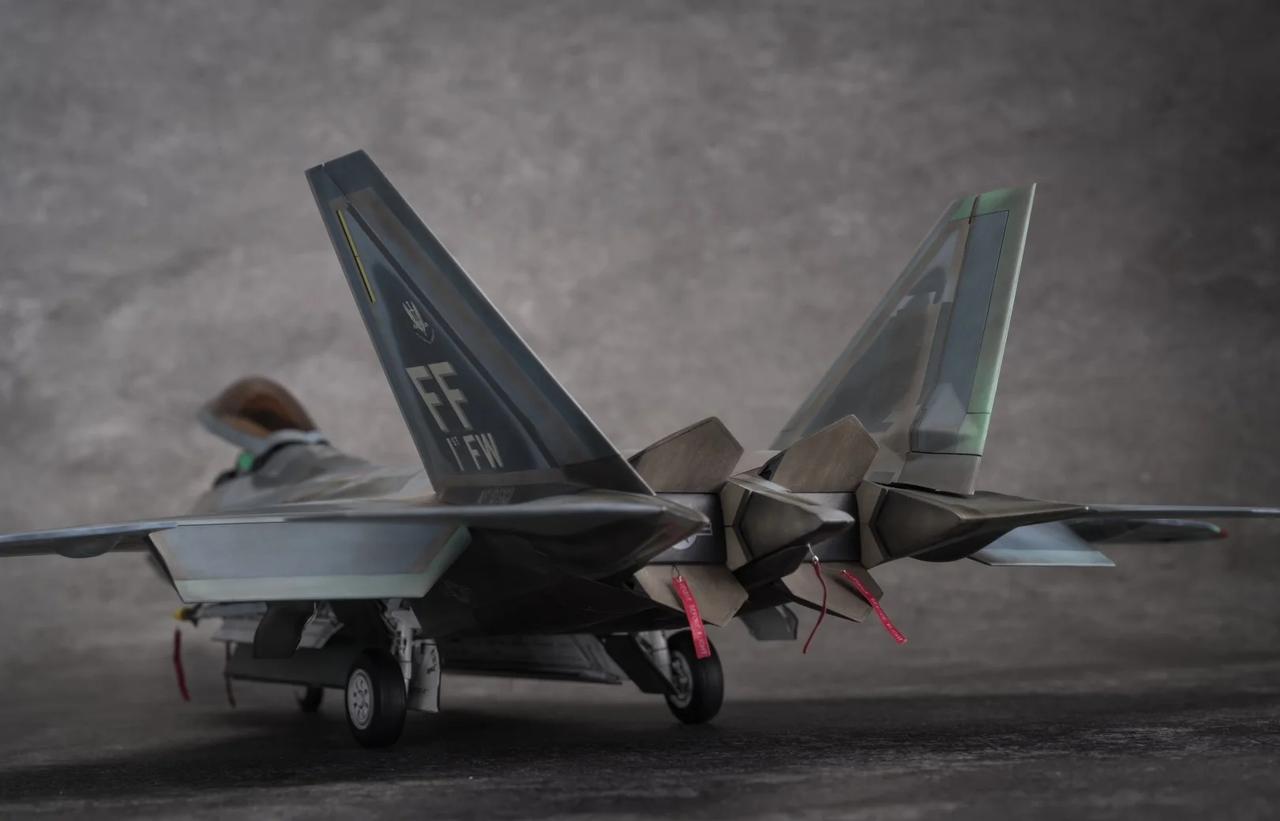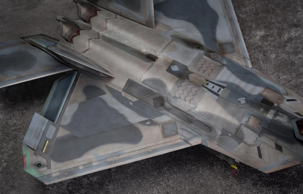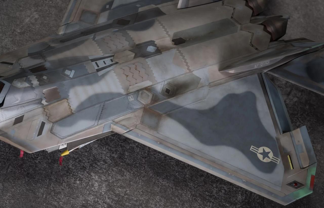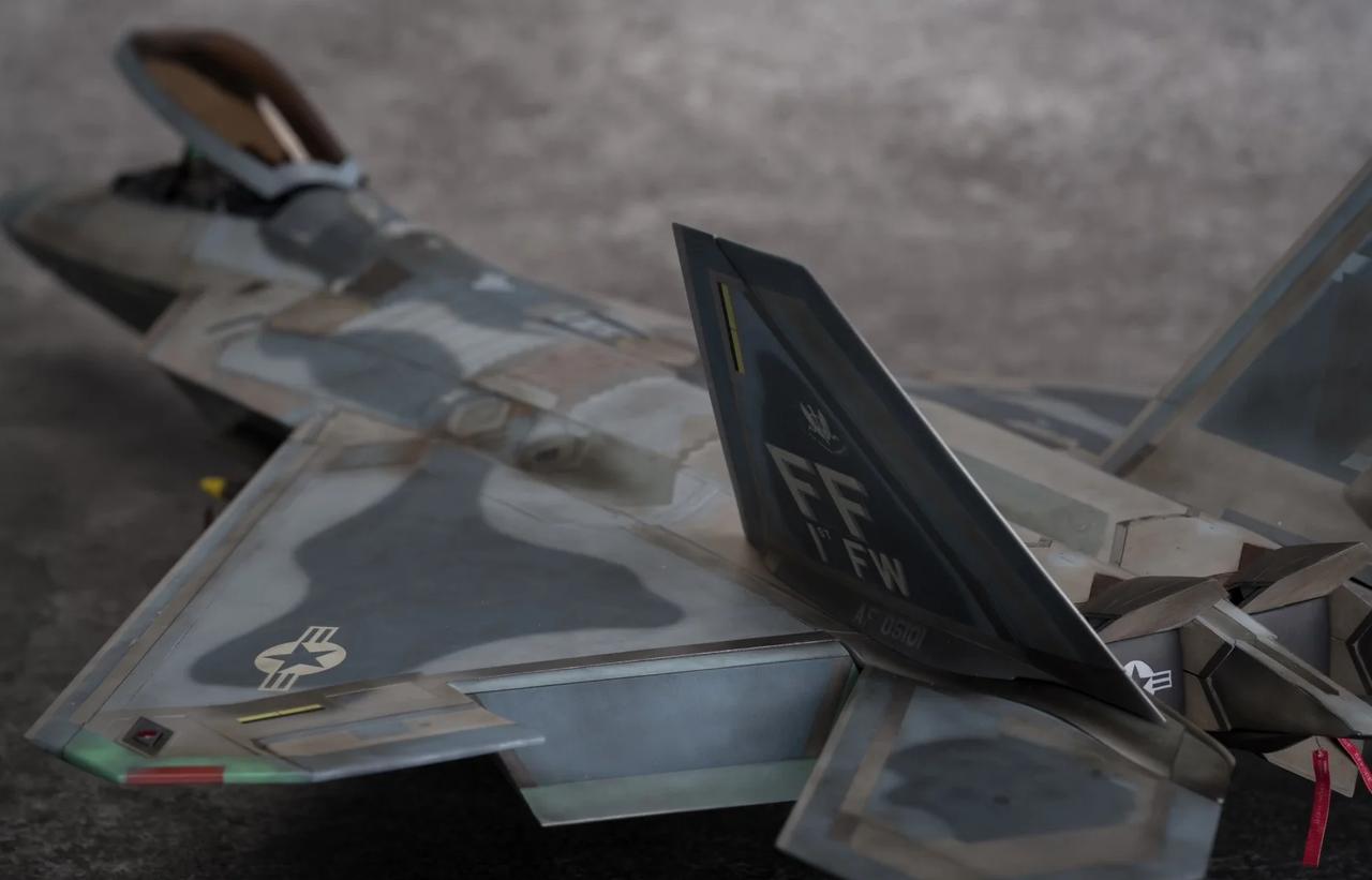 1/48 F-22 Raptor猛禽战斗机制作完毕! 定妆照放出! 也是得益于氧化铁隐身涂层还有牢美拉胯的后勤维护,猛禽战斗机的隐身图层也呈现出独特的腿色旧化状态。 所以这次的涂装主题就以重口味为主。机背选取了飞行表演队的一架涂装,应该是飞的比较多平时经常拉出来风吹日晒,腿色掉漆无数后又反复刷了新的补丁涂层上去,最后呈现除了迷彩补丁反复叠加的复杂涂装状态。这也算是牢美现役猛禽里补丁较多的一架了。主翼翼尖和斜垂尾边缘腿色呈现出的淡绿底漆层也算是这架的特点之一了,个人非常喜欢,比其他的猛禽金属色补丁漆面蒙皮又多了一点颜色跳跃。 机底选择了另一架,主翼大面积腿色后,淡绿色底漆从金属漆面若隐若现透出来也是比原本灰蒙蒙的金属色涂层面更有看点。机背机底不是出自同一架(考证什么的不存在的[偷笑]),而是分别来自个人比较喜欢的两架的实拍照片。照片其实根据光线天气角度和拍摄者的风格也会和实机有所区别,涂装也是以照片为基础加入了偏个人喜好的理解。 因为选取的涂装参考照片也是猛禽里比较复杂的,实际制作涂装的过程也是cpu持续过载,掉了不少头发[扶额R],蒙皮色的调漆都调了20多瓶,还不算临时调的一些深浅变化和金属色半金属色的变化,不过好在完成后也算是自己比较满意的完成度了。 军事模型 飞机模型 模型 军模 模型制作 五代机 手工日常 比例模型 模型涂装