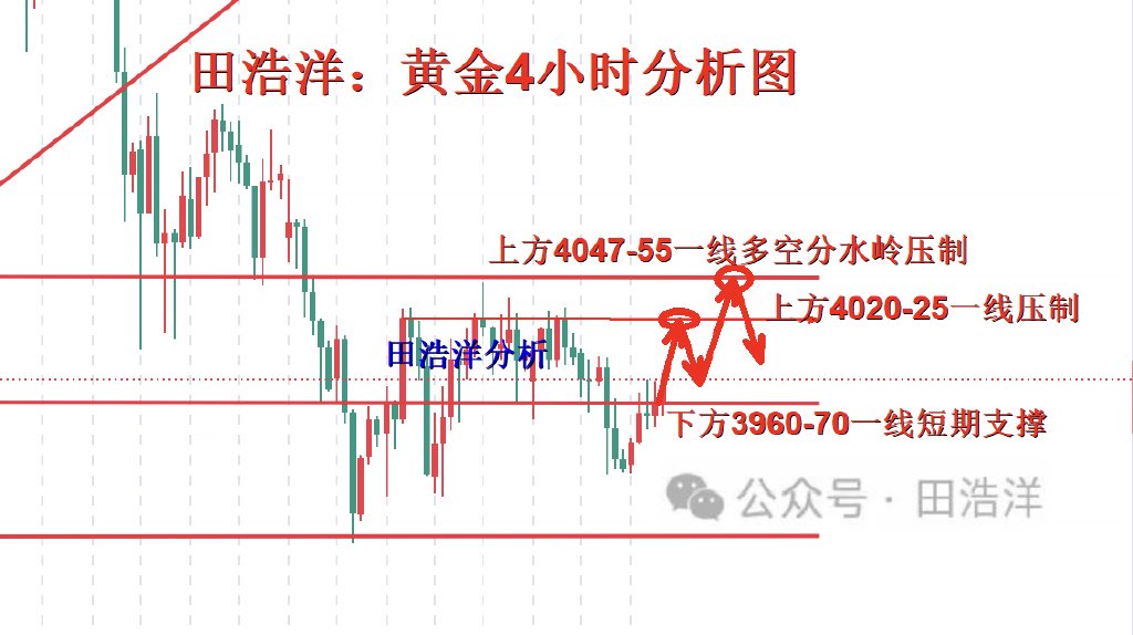 从4小时行情走势来看,目前上方关注短期压制4020-25一线,重点关注4047-55一线多空分水岭,短期关注3960-70一线支撑,重点关注前期低点3888-90一线支撑,操作上田浩洋建议以反弹做空把握为主,中间位置一律多看少动谨慎追单,耐心等待关键点位进场。具体操作策略我会在盘中提示,及时关注。