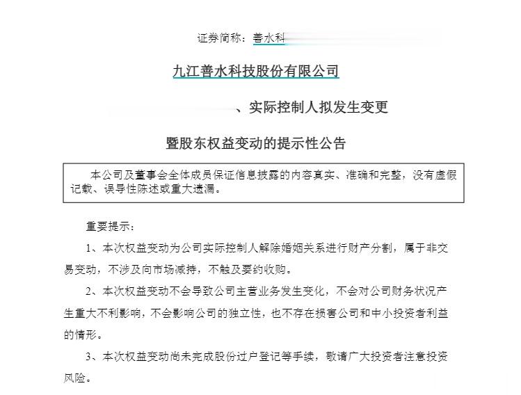 对于公司控股股东、实际控制人拟发生变更,善水科技表示,本次权益变动为公司实际控制人解除婚姻关系进行财产分割,属于非交易变动,不涉及向市场减持,不触及要约收购。本次权益变动不会导致公司主营业务发生变化,不会对公司财务状况产生重大不利影响,不会影响公司的独立性,也不存在损害公司和中小投资者利益的情形。
