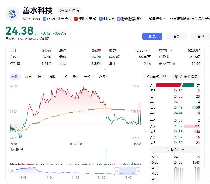 11月7日,善水科技收跌0.49%,报24.38元/股,总市值52.33亿元。