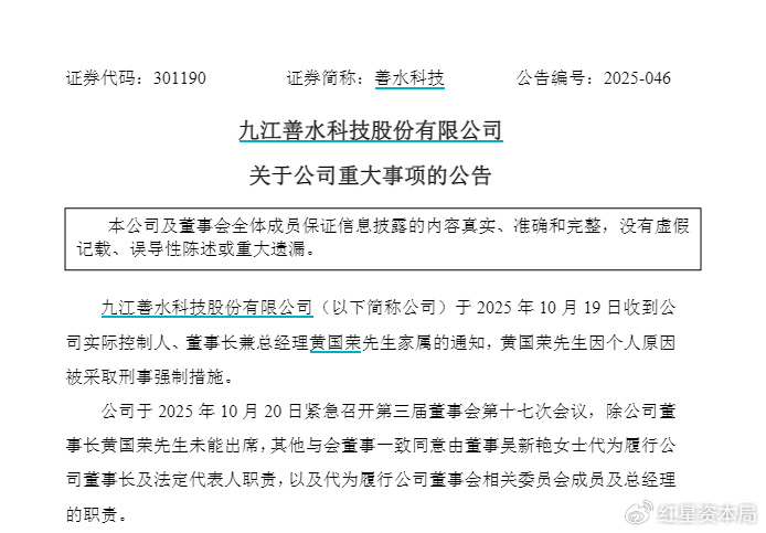 值得注意的是,就在半个多月前的10月20日,善水科技公告称,公司于2025年10月19日收到公司实际控制人、董事长兼总经理黄国荣家属的通知,黄国荣因个人原因被采取刑事强制措施。