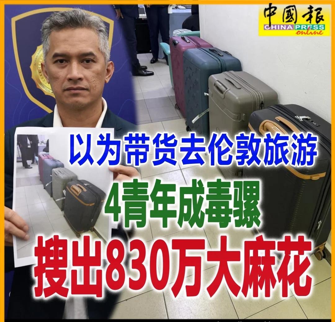 天真无邪最坏的结果就是死刑 (吉隆坡6日讯)4名大马年轻男女被网上高薪兼职工作吸引,以为去欧洲旅游代购,没想到却成为毒骡,准备携86公斤价值830万令吉的大麻花前往伦敦时,遭执法官员发现,当场被捕! 大马边境管制与保护机构(AKPS)总监拿督斯里苏海利今日召开记者会指出,槟城国际机场警局(LTAPP)于本月3日晚上8时15分,发现4名嫌犯(皆20余岁)的随身行李箱中,藏有可疑物品,因此阻止4人登机。