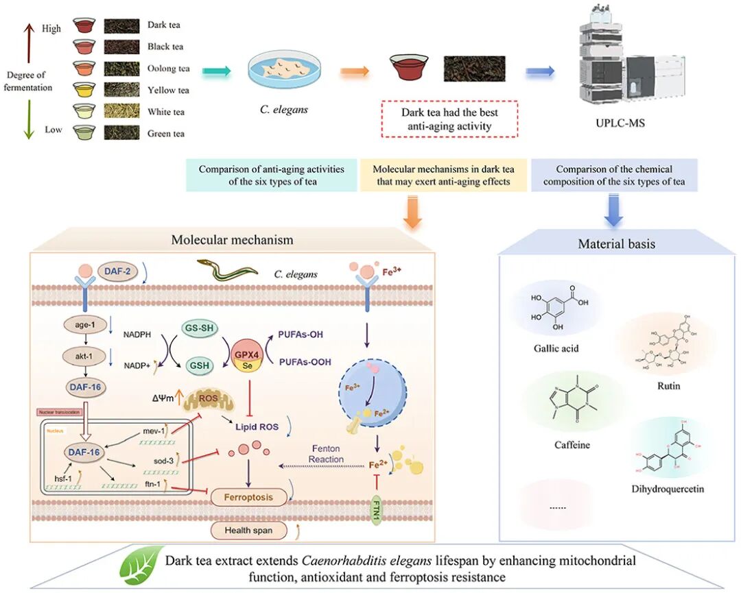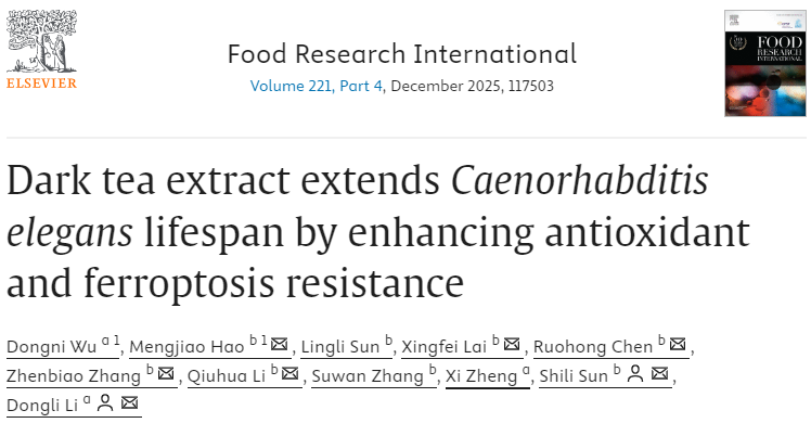 近日,来自中国江门市五邑大学的研究团队在FoodResearchInternational杂志发表题为“DarkteaextractextendsCaenorhabditiseleganslifespanbyenhancingantioxidantandferroptosisresistance”的文章。