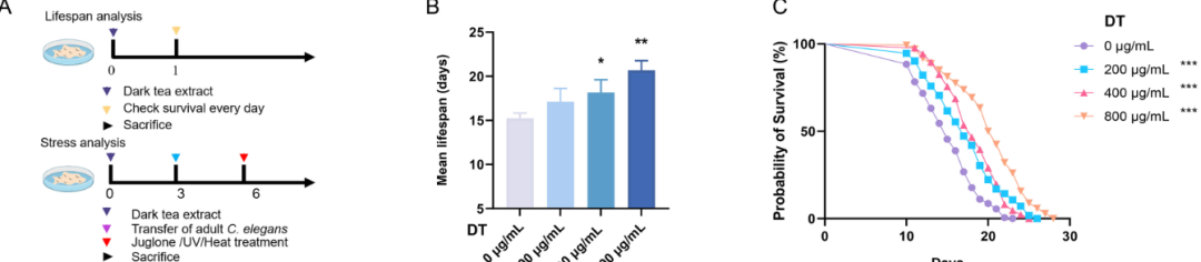 为了进一步证实DT的优越性,研究人员评估了L4期线虫暴露于不同浓度DT(200、400和800μg/mL)后的寿命和抗逆性。结果发现,经DT提取物处理后,秀丽隐杆线虫的平均寿命分别比对照组延长了15.42%、20.12%和34.61%。这表明DT以剂量依赖的方式促进秀丽隐杆线虫的寿命。