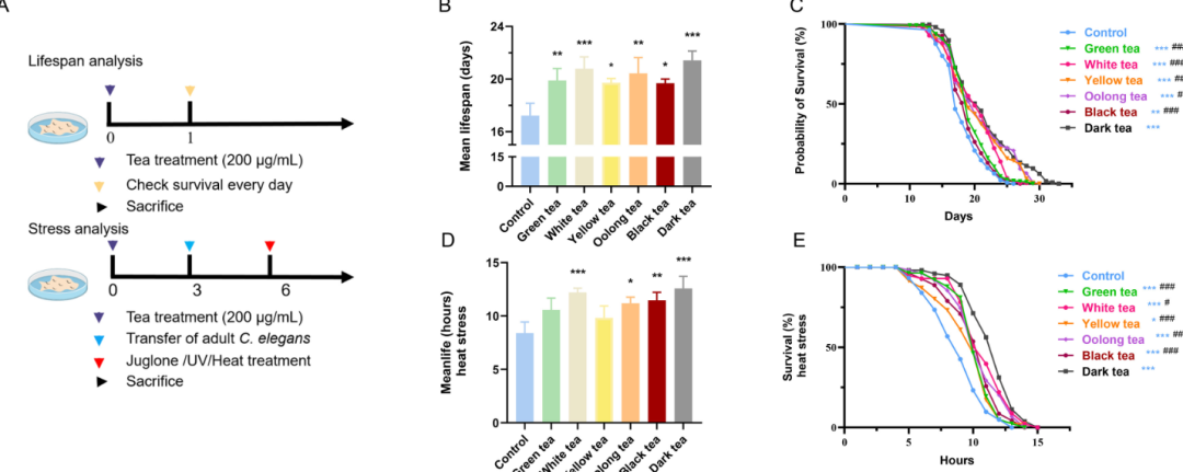 该研究发现,绿茶(GT)、白茶(WT)、黄茶(YT)、乌龙茶(OT)、红茶(BT)和黑茶(DT)提取物均能延长寿命并增强抗压能力。令人惊讶的是,黑茶(DT)具有显著的抗衰老延寿功效,最高可将寿命延长34.61%。