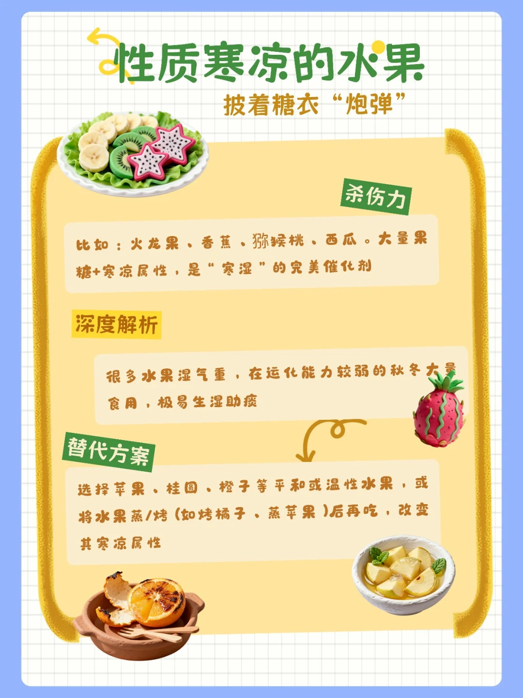 深度解析:很多水果湿气重,在运化能力较弱的秋冬大量食用,极易生湿助痰。