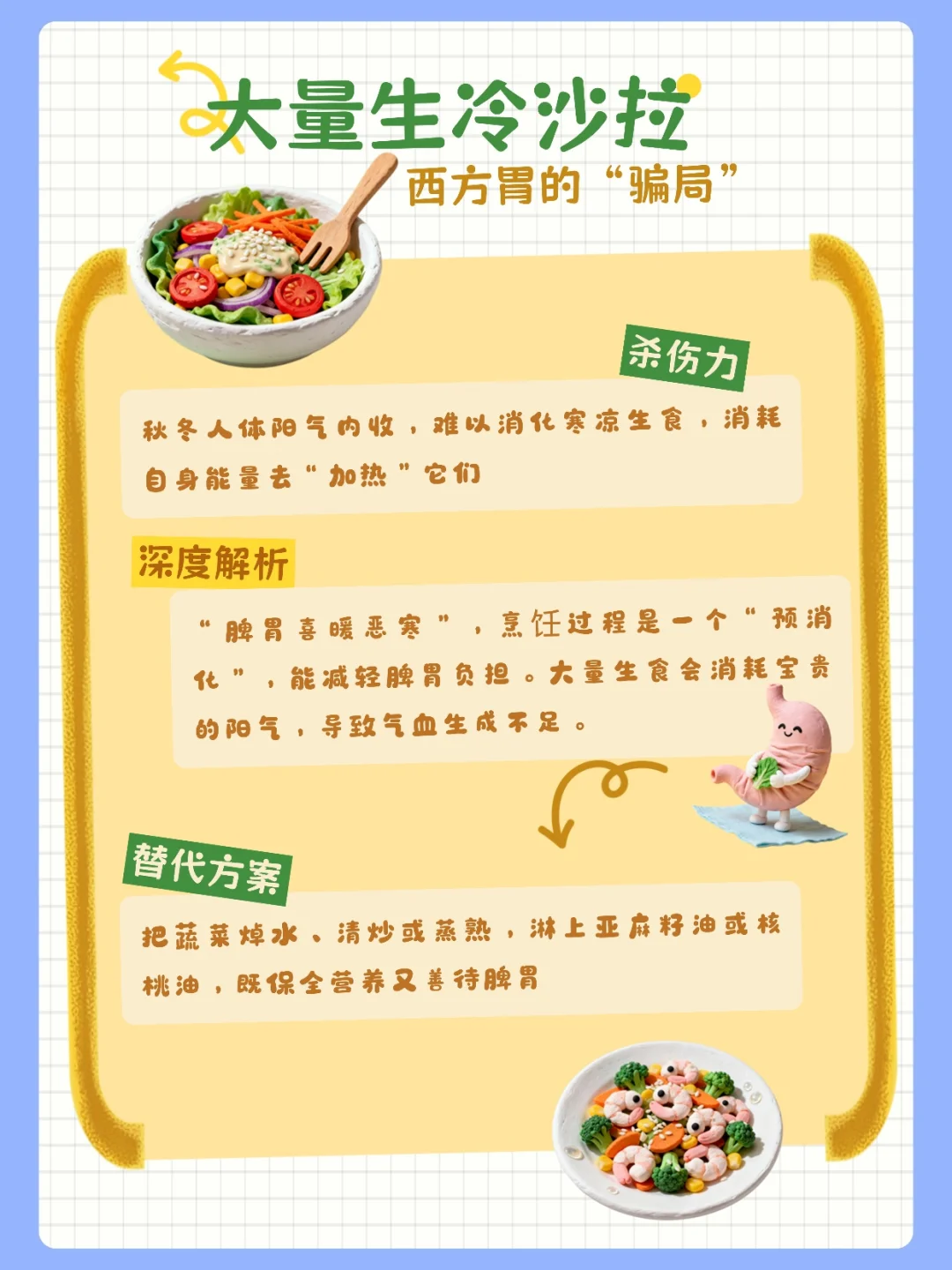 杀伤力:秋冬人体阳气内收,难以消化寒凉生食,消耗自身能量去“加热”它们。