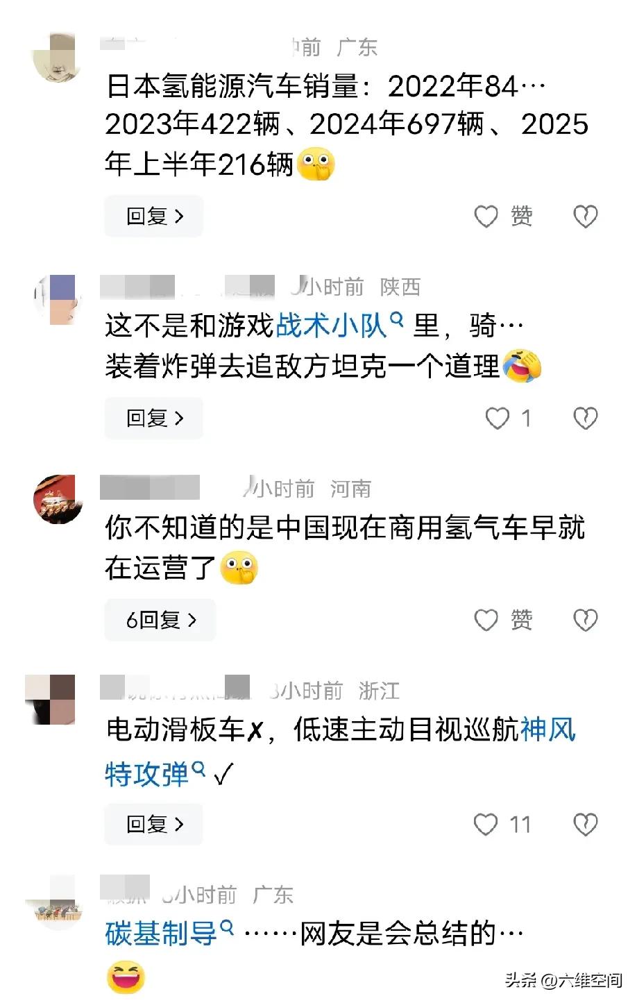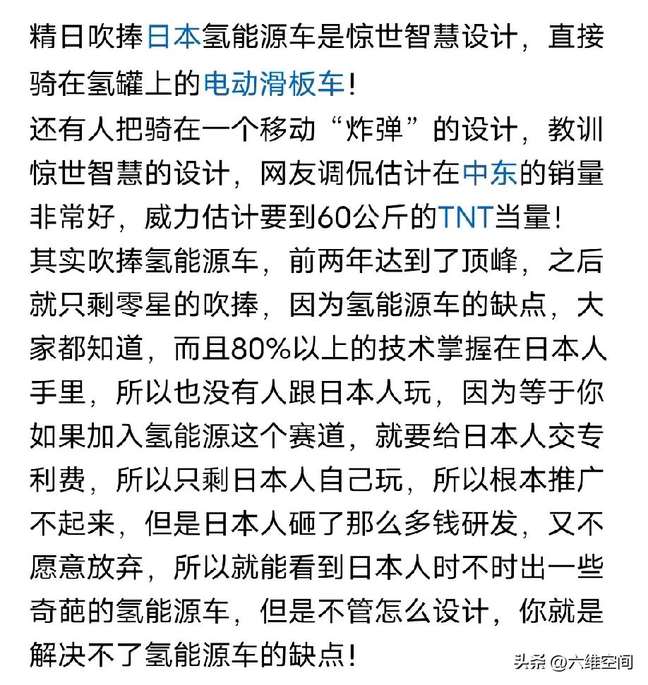 精日总是吹日本氢能源车,可是连日本人自己都买账,日本一年氢能源车销量只有几百辆,氢能源车的优点很多,缺点只有一个,但是这个缺点就足以让你望而却步了,日本人号称掌控的氢能源车80%的专利,但是造出来日本人自己都不买,原来是准备卖给中国人,所以大量的公知和精日都在狂吹氢能源车,这几年已经少了点,还有是在吹的,现在连滑板车都氢能了,但是看这个设计,基本上就是骑在一个当量起码几十公斤的炸弹上面一样,这种反人类的设计,精日也敢狂吹,真的服了!