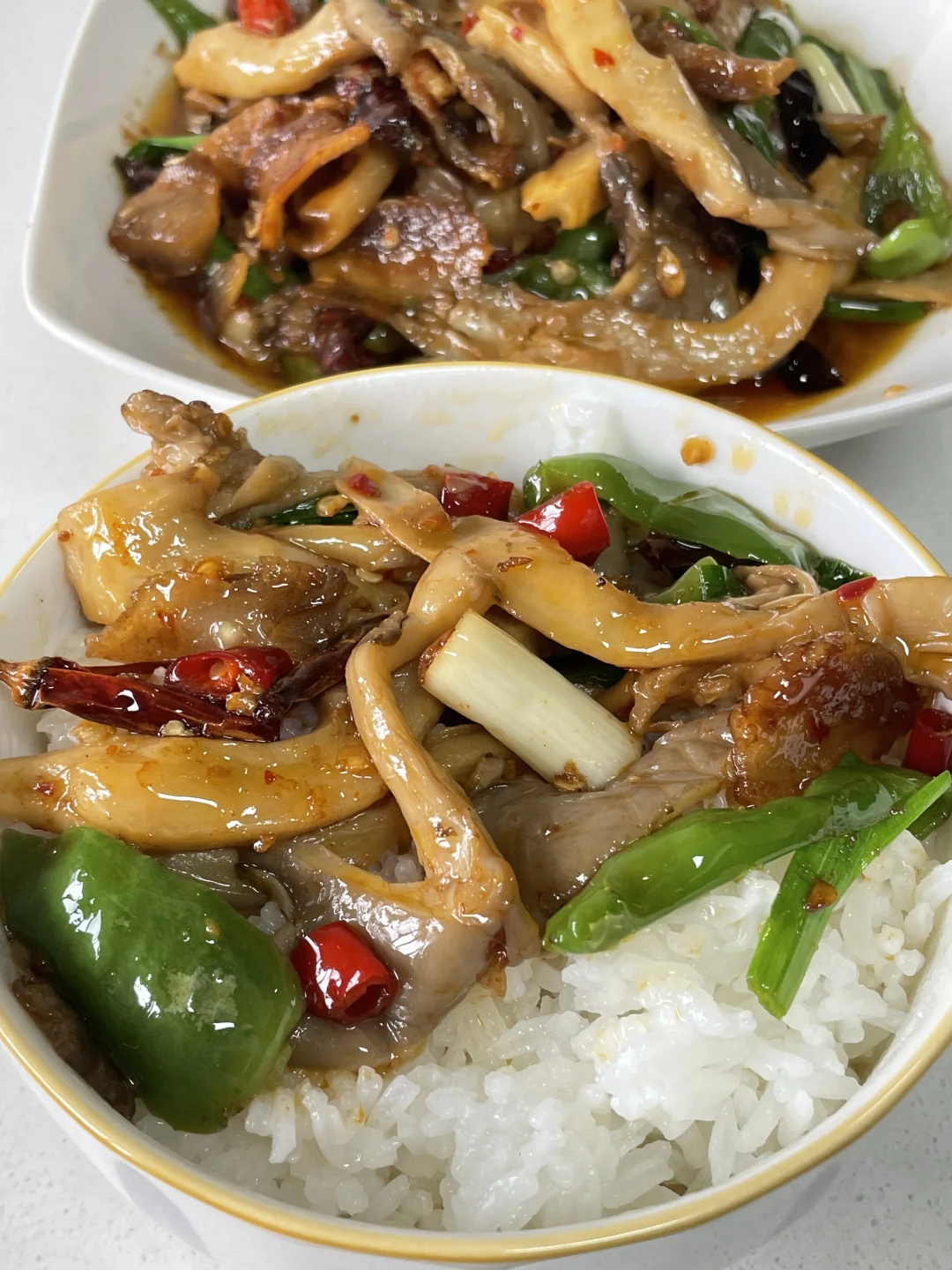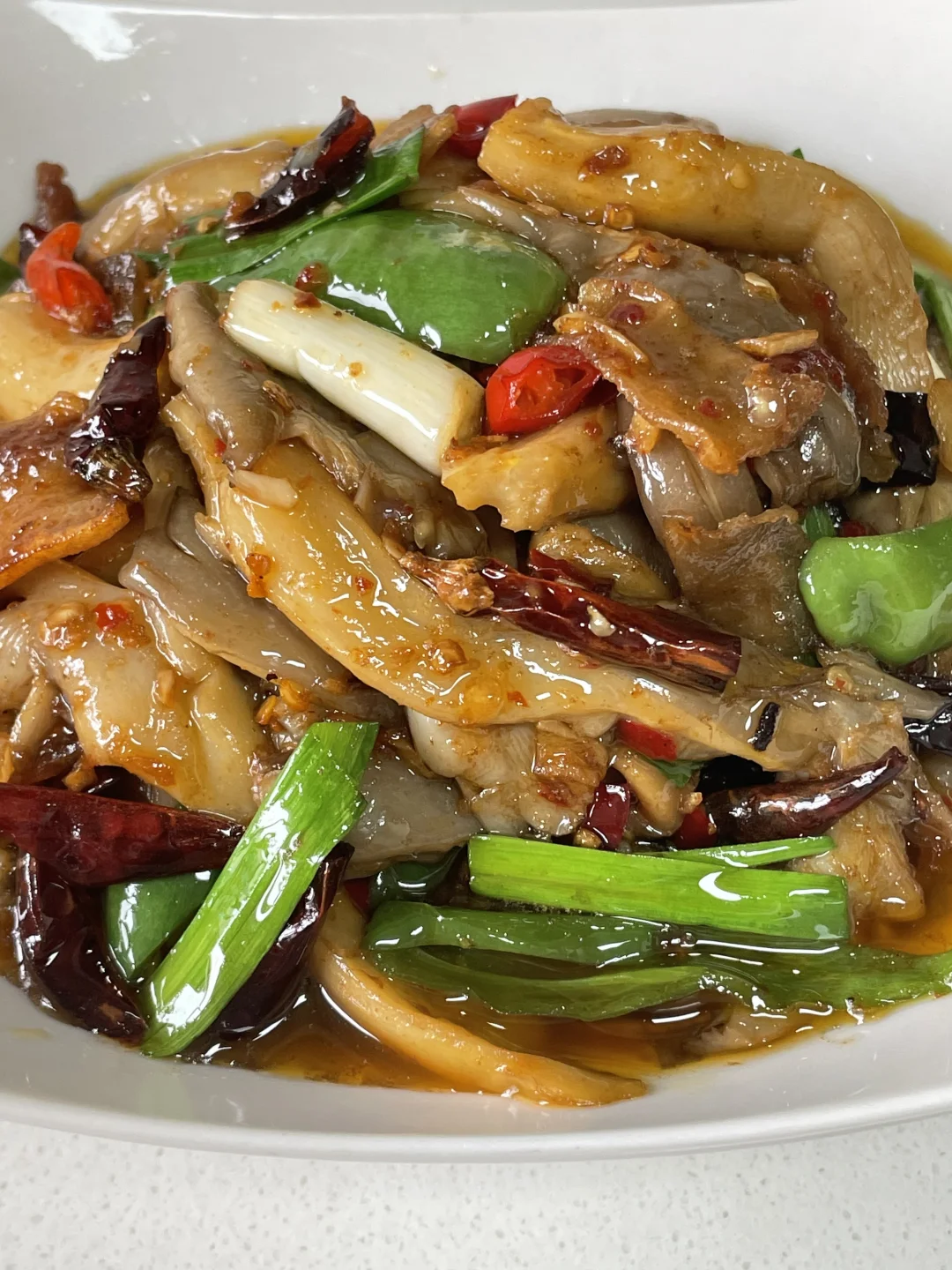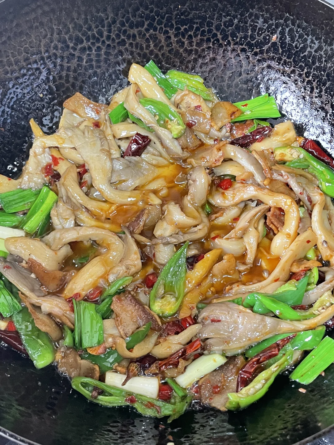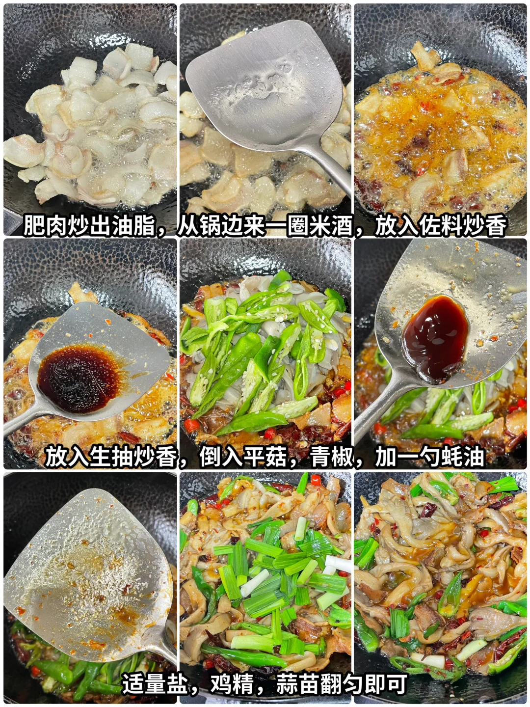 姐妹们,今天给大家出一个巨下饭的家常菜平菇炒肉。这样做出来的肉不会腥也不会柴,平菇也入味,真的是巨下饭。喜欢的姐妹可以尝试做一下。 🌶️食材:平菇,肥肉 👩🍳做法: 1⃣️肥肉切片,青椒切块,准备一些干辣椒、小米辣,糍粑辣椒,蒜,蒜苗切段,平菇焯水备用。 2⃣️起锅肥肉炼出油脂,从锅边来一圈米酒,放入佐料炒香,加入一勺生抽炒香,倒入平菇,青椒,加一勺蚝油,适量盐,鸡精,蒜苗,翻匀即可出锅。这样做出来的平菇炒肉真的是巨下饭,喜欢姐妹试试吧