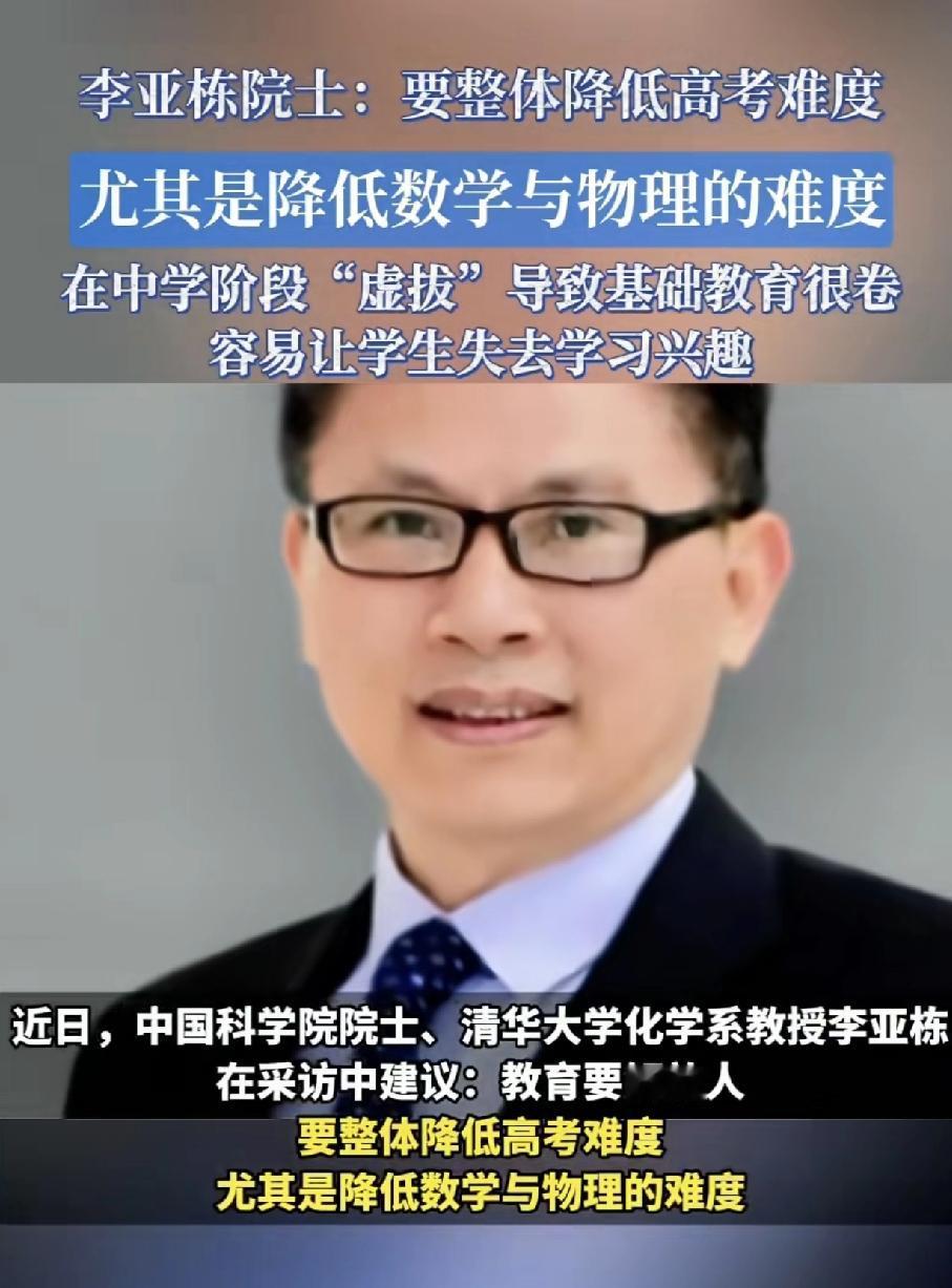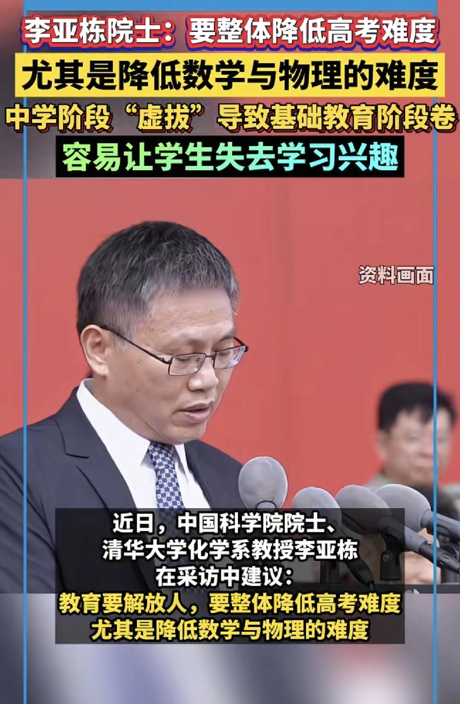 考试是老百姓唯一靠智商出头的机会,院士提出降低高考难度,尤其是数理化,那高考的意义是什么呢!考试的意义怎么体现,数理化难度高,会就是会,不会就真不会,及时把没有天赋的直接淘汰,免得误人子弟,但是可以把英语分数降低了,现在那么多音译软件,这英语的含金量也就那样了。