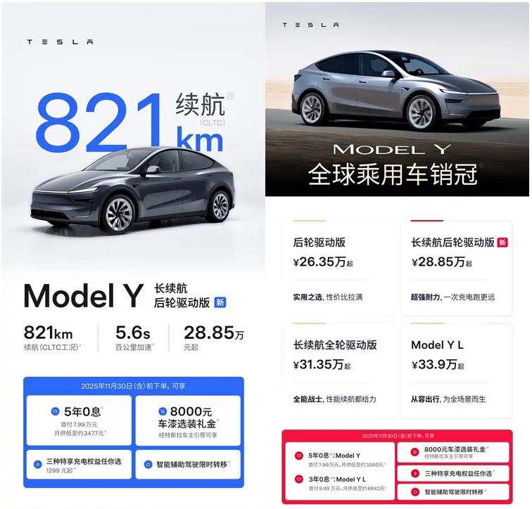 11月8日,汽节车社从特斯拉中国了解到,Model Y长续航后轮驱动版正式上市,售价为28.58万。 作为新增车型,其整体外观延续现款车型设计风格,其长宽高分别为4797/1920/1624mm,轴距为2890mm,车尾左侧应用与长续航全轮驱动版相同的“Model Y+”标识,并提供19英寸和20英寸轮圈可选择。 动力方面,特斯拉Model Y长续航后轮驱动版最大功率为225千瓦驱动电机,相比现款在售后轮驱动版最大功率提升5千瓦。电池方面,其搭载容量为78.4千瓦时三元锂电池组,CLTC工况续航里程为821公里。 点个关注吧!汽节车社,车圈热点资讯每日一扫清!【来自懂车帝车友圈】