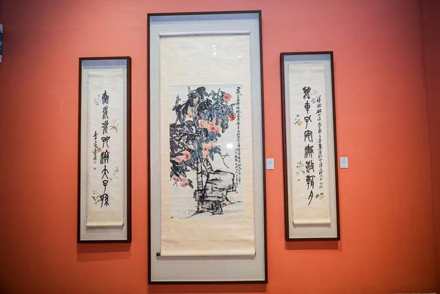 王一亭的《桃实图》与吴昌硕的《篆书八言联》加以组合,悬挂于最为醒目的一面展墙上,拉满传统大户人家的仪式感。明代晚期起,这样的书画常常被悬挂于厅堂正中,逐渐取代屏风成为厅堂主流陈设,也彰显出书画的市场需求。