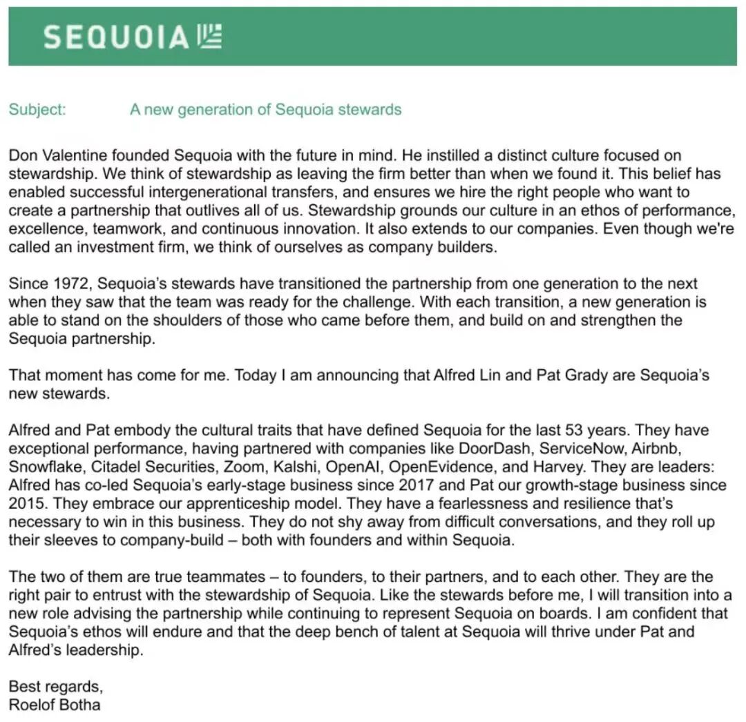 博塔在公开信中表示,自己会像之前的管理者一样,转任为其投资的初创公司提供咨询,同时继续在董事会代表红杉资本。