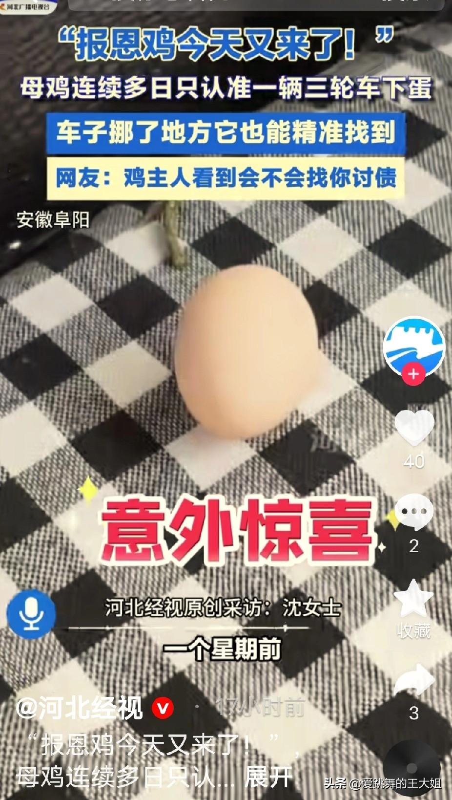 “笑不活了!”安徽阜阳,女子连续一周在自己的电动车里捡到鸡蛋。万万没想到,是小区里一只溜达的母鸡每天跑到她车里下的蛋。更让她惊讶地是,无论她把电动车停在什么位置,这只母鸡都能找到。 这事儿在小区里都传成了笑话,申女士每天早上的头等大事就是检查车座。那只羽毛光亮的母鸡简直像个神秘的快递员,准时送达一颗热乎的鸡蛋,从不误点。邻居们开玩笑说这鸡准是装了GPS,那么多电动车停着,它就认准了申女士这一辆,不是“报恩”都解释不通。有人把视频发到网上,这只母鸡一夜之间成了网红,被大家亲热地叫做“溜达报恩鸡”。 母鸡认准一个地方下蛋的执着劲儿,暴露了动物身上那种人类难以理解的方向感。鸡这种生物其实挺有灵性,浙江就有位张师傅把母鸡当宠物养,那鸡不仅能稳稳站在自行车车把上跟着主人到处跑,还特别通人性,一呼唤就过来。河南还有更绝的,一只母鸡不知怎么钻进了樊女士的汽车底盘,居然在车子每天行驶的晃动中,硬是把一窝小鸡给孵了出来。这么一想,阜阳这只母鸡能精准找到申女士的电动车,也不那么奇怪了,它们确实有我们想不到的生存智慧。 咱们别光顾着看热闹,这事儿折射出城市生活中人与动物关系的那种微妙变化。在高楼林立的小区里,突然冒出这么一只坚持给你“送温暖”的母鸡,那种反差感才是让大家觉得好玩的原因。某种程度上,这只鸡成了连接城市与自然、规则与随性的一个有趣符号。 换个角度看,这只母鸡不经意间完成的,是一次完美的“暖心营销”。它用最原始的方式——一颗实实在在的鸡蛋,触动了大家内心柔软的地方。这种互动比任何刻意设计的活动都来得自然。就像淮北那位张女士,她只是把废纸箱留给保洁阿姨,却意外收到了阿姨回赠的土鸡蛋,这种人与人之间的善意循环,瞬间温暖了无数人。 咱们也得冷静想想,这种现象背后是否隐藏着城市养鸡的管理难题。申女士的故事有趣,是因为这只鸡“有分寸”,只下蛋不扰民。要是每个居民都在小区里散养家禽,恐怕就不是趣闻而是投诉了。杭州那位把母鸡当宠物养的张师傅就特别提到,他养在院子里,母鸡不吵不闹,才不会影响邻居。城市管理需要在人情味和公共秩序之间找到平衡点,这事儿给大家提了个醒。 一颗突然出现的鸡蛋,一座钢筋水泥森林中的小确幸,让成千上万的网友会心一笑。大家转发、评论、点赞,其实是在表达对这种意外之喜的向往。生活中总需要点不期而遇的温暖,哪怕是来自一只固执的母鸡。安徽特别是淮北地区“好人文化”底蕴深厚,这种邻里间的温情互动,或许正是这种文化在日常生活中的细微体现。 各位读者你们怎么看?欢迎在评论区讨论。