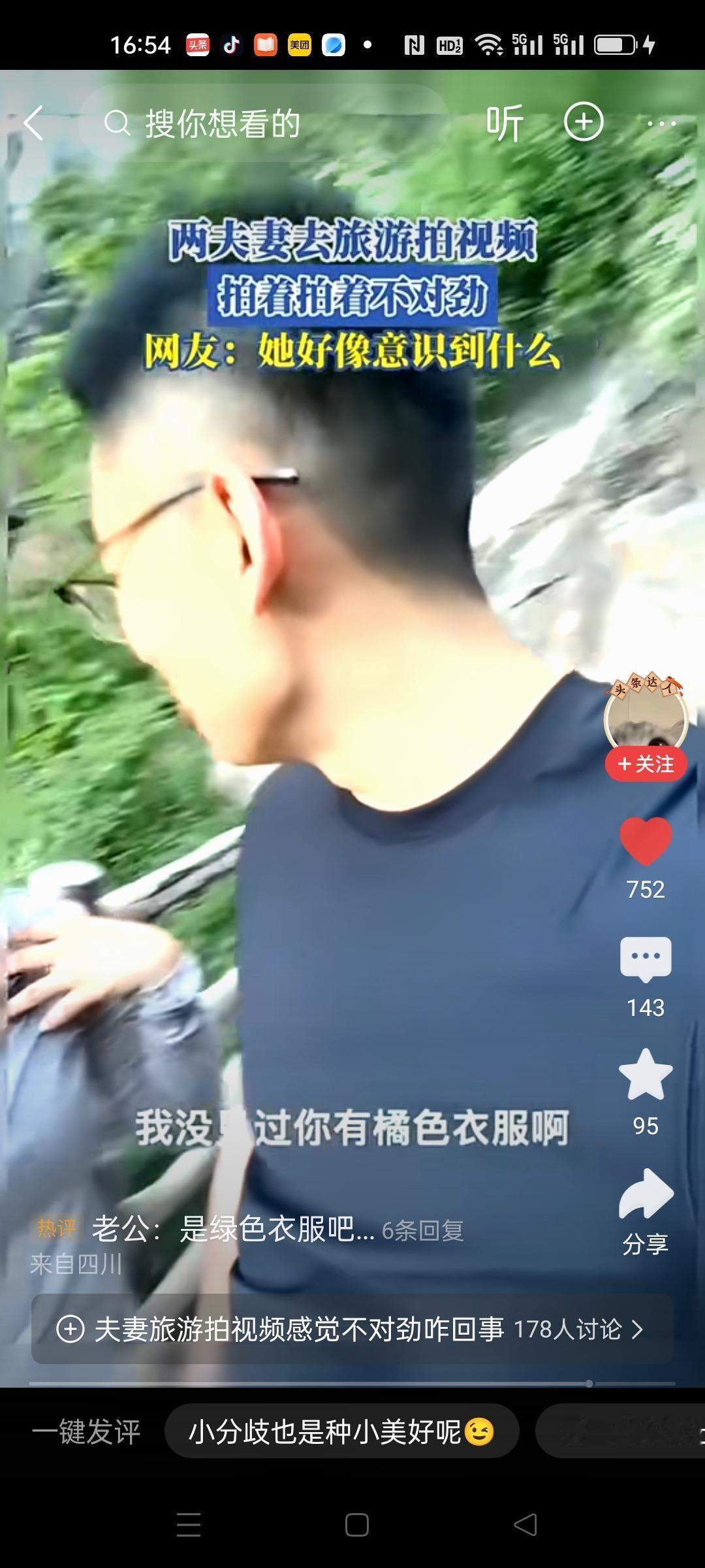女:老公你记得我们在那拍的一张照片吗? 男:没有啊,我第一次来 女:拍了啊,那次我穿的橘色衣服 男:我没见过你有橘色衣服啊 女:怎么可能,就在那,我俩拍了照片啊 男:哦,是的,你穿的橘色衣服,我戴的绿色帽子 女:。。。。没关系,老公,谁的新欢不是别人的旧爱 友情提示:友友们,下次再去哪玩,说话前你们要想清楚,到底和谁去的,不然容易引发家庭矛盾