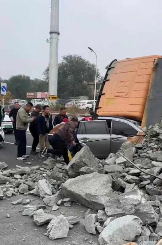 烟台渣土车发生侧翻,宝马车直接被压扁,群众徒手搬石头救人!画面让我看哭! 2025年11月7号下午,山东烟台的芝罘区电厂东路与红旗西路交叉口上面,一辆渣土车转弯的时候突然发生了侧翻,而且正好砸在了旁边车道上的两辆小轿车。 这时候,旁边很多过路的人和车子纷纷停下来,什么都没说,也不需要说什么,都很快的到上面搬石头的搬石,运土是运土,也不顾有什么危险,甚至什么工具也没有,都在用手清理着碎石和搬开其他的重物,半小时后终于看到了压在下面的车子,很多人用力拉开了车的后门,才把里面的人员救出来。 可是,结局,宝马车的车顶已经被完全压垮了,而且车身基本上都被碎石掩埋,车头已经严重变形,驾驶位已经完全看不清楚了,幸好后车只是被轻微擦边加上被很多土和碎石盖住,没有严重的事。 等到消防人员到现场后把救出的司机,紧急送医院抢救了。 交警看了宝马车的行车记录仪,发现车主已经在紧急转向避险了,但是还是没有逃脱。 现在官方出来回应,造成了1个人不幸身亡1个人轻微擦伤局面,渣土车的司机已被控制,已经排除了酒驾。 现在大多数开渣土车的很多都是新手,真的要远离! 在这里为在现场救人的所有人点赞!平凡人就是英雄! 警示大型车辆转弯的时候在货车的盲区是很危险的,过路的人和车辆一定要保持安全的距离。