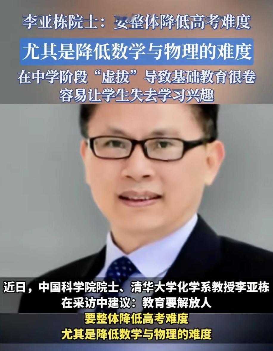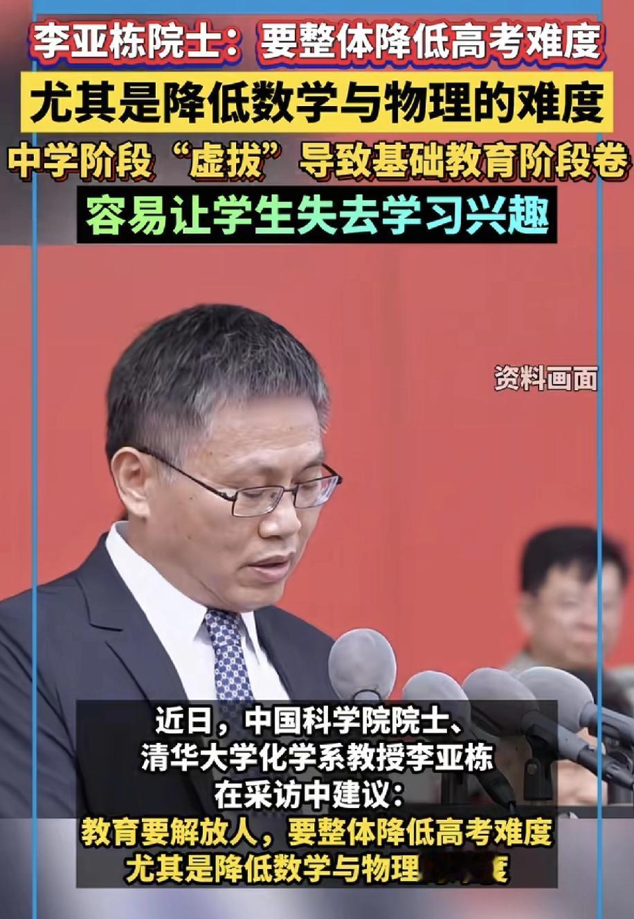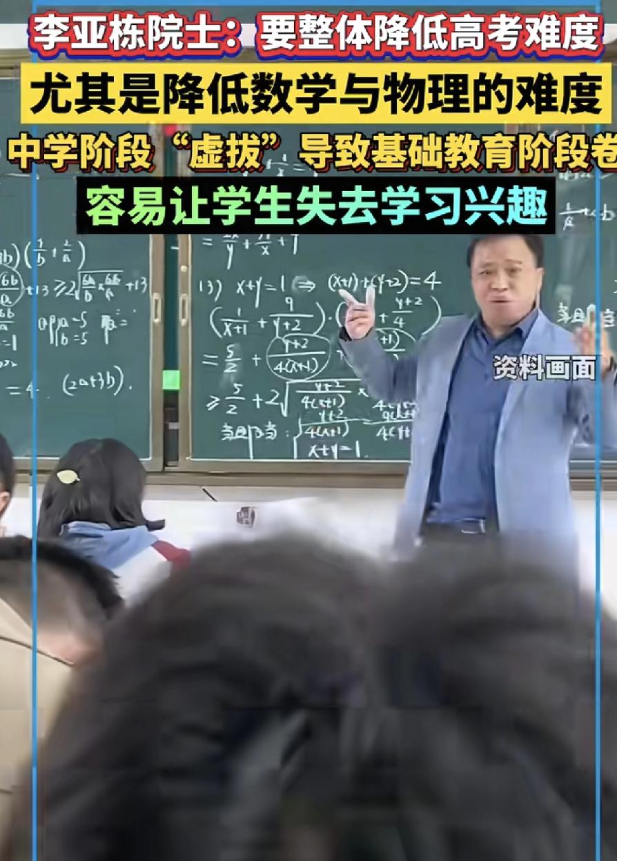 院士谈降低高考难度,尤其要降低数理化难度,怕学生失去学习兴趣。但他明白什么是高考吗?为什么要高考,他比谁都明白,高考是大浪淘沙,难度越大,沙子淘出越多,如果降低难度,这分数怎么划分,一堆的高分在那,到时候英语就显得突出了,农村孩子,天赋再高,但是先天缺环境,英语都会有缺陷,但数理化需要天赋,那不会就是不会,可不是请名师刷题能弥补的。