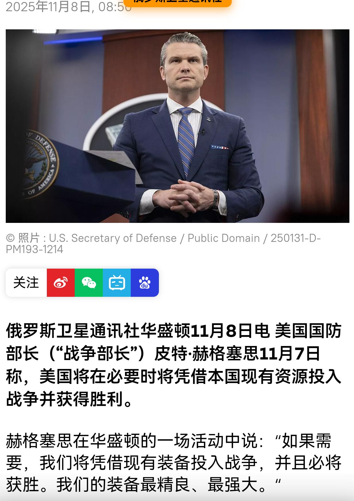 美国国防部长赫格塞思11月7日称,美国装备最精良、最强大,如果有需要,凭现有的装备投入战争必将取得胜利。 言下之意就是美国凭现有装备就能打败所有对手咯。 历史是不会骗人的,这是路径依赖!细数了一下二战后美国发动的对外战争,的确,绝大部分都取得了胜利!但是,大多都胜之不武!当然,也有让他们至今都望而生畏、刻心铭骨的! 时至今日,赫格塞思依然觉得美国“装备最精良、最强大”,认为凭现有装备美国就可以打败所有对手。对此我感到很欣慰,不得不说,他很称职!美国现在很需要这样一个人,从精神层面“激励”所有美国人! Good job!