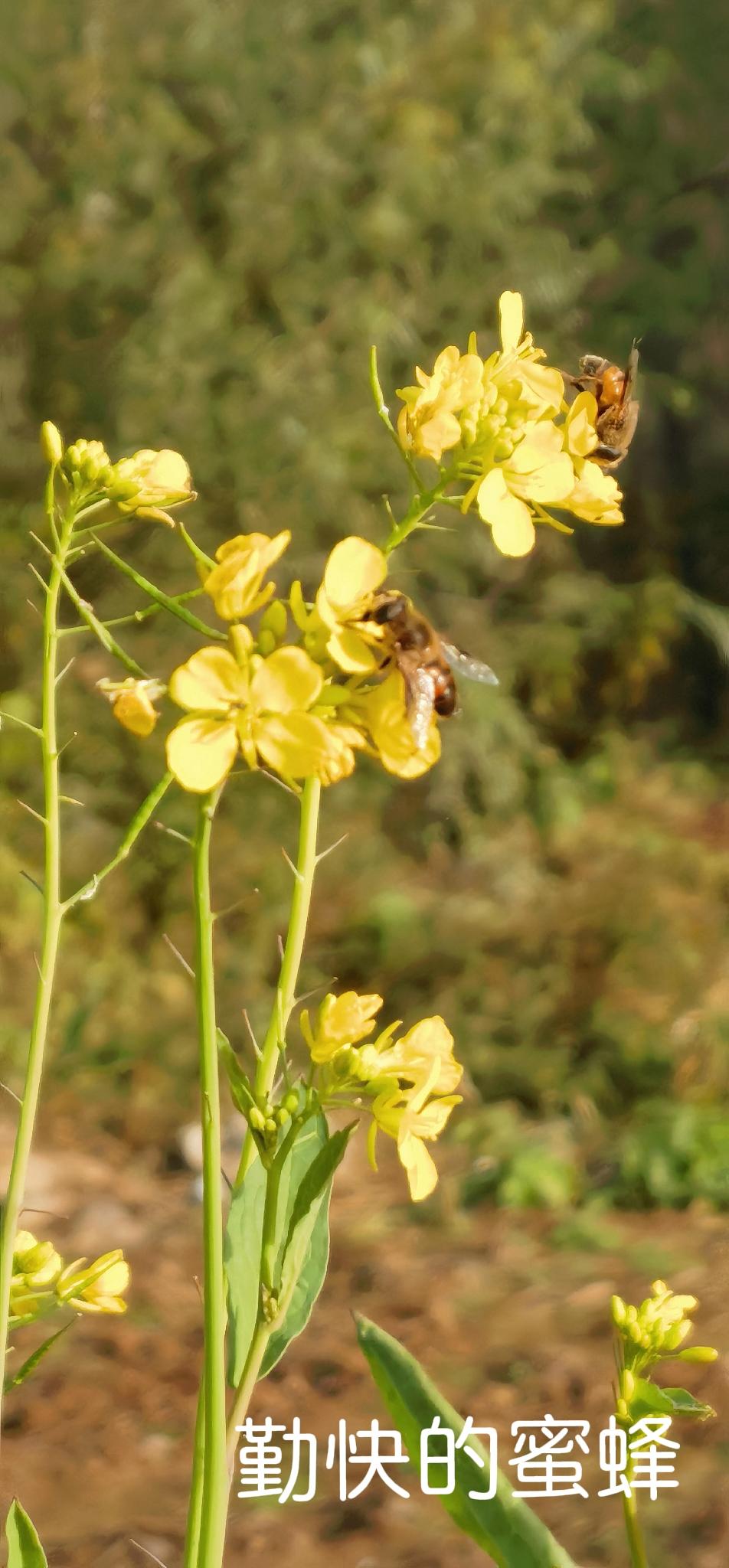 初冬见闻。 路边的油菜花璀璨夺目。 勤奋的蜜蜂,采集最后的花粉。