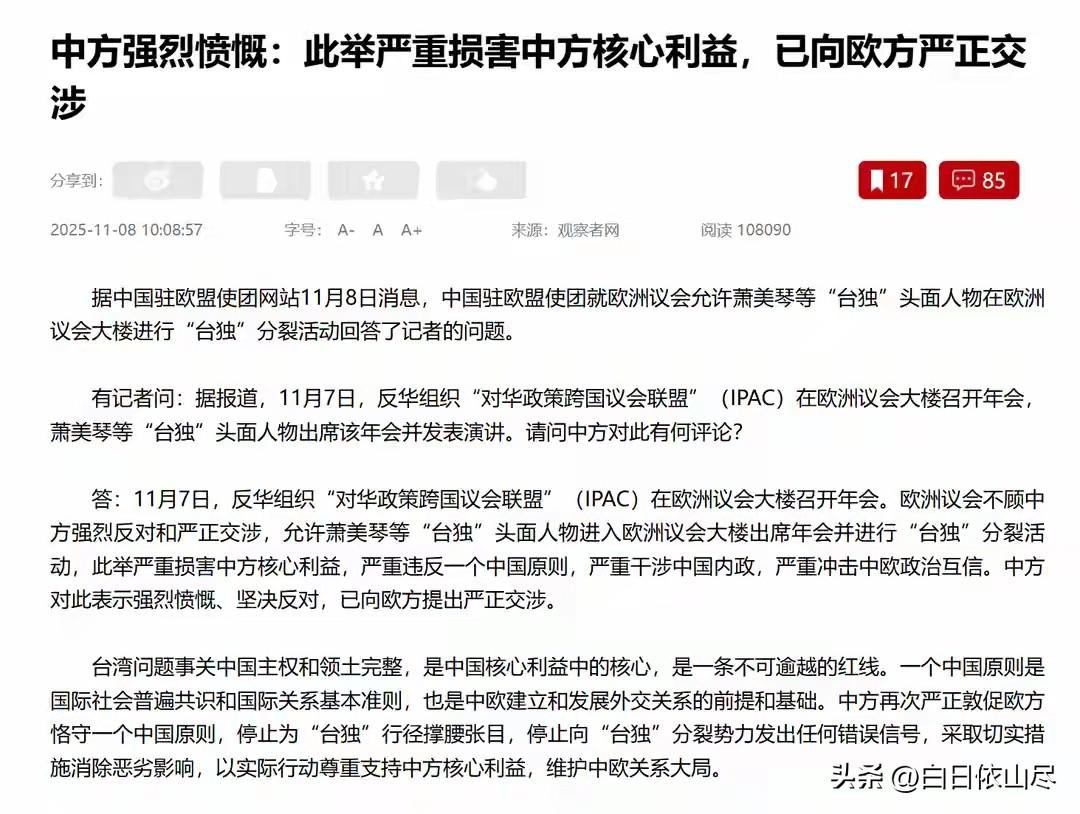 眼看赖清德扛不住,美破天荒向大陆提要求,欧洲给“台独”搭舞台 据观察者网等媒体报道,反华组织“对华政策跨国议会联盟”在欧洲议会大楼召开年会,萧美琴等“台独”头面人物出席该年会并发表演讲。 大陆打击“台独”的重拳接连落下,“台独”核心分子接连陷入困境之际,美国突然抛出罕见要求,欧洲更是直接为“台独”势力搭建起公开活动的舞台,台海周边的博弈骤然升级。 全球通缉“台独”骨干沈伯洋的雷霆行动余波未平,大陆方面已明确表态,赖清德之流的分裂行径必将受到正义的严厉审判,而就在这些分裂分子惶惶不可终日时,外部势力的插手让局势变得更加复杂。 布鲁塞尔的欧洲议会大楼内,一场打着“全球民主”旗号的年会彻底沦为“台独”分子的分裂秀场。反华组织“对华政策跨国议会联盟”(IPAC)在此召开四年一度的年会,民进党副领导人萧美琴带着林佳龙等“台独”头面人物高调出席,甚至登上讲台发表长篇演讲。 她在发言中刻意歪曲事实,妄称“台湾是民主国家”,将大陆的反分裂举措污蔑为“军事压力和网络攻击”,还离谱地提出要在2030年将台湾防务预算提升至GDP的5%,试图用渲染“安全威胁”的方式博取欧洲政客同情,其本质不过是借国际平台兜售分裂主张,呼应岛内的选举策略。 更值得注意的是,台下的欧洲议员不仅全程默许,部分人还频频点头附和,让这个本无实质决策权的松散组织,成为了分裂势力传播“台独”言论的工具。 中国驻欧盟使团第一时间作出强硬回应,连用四个“严重”严正指出,欧方允许“台独”分子在欧洲议会官方场地从事分裂活动,严重损害中方核心利益,严重违反一个中国原则,严重破坏中欧关系政治基础,严重践踏国际关系基本准则,并立即向欧方提出严正交涉,要求其消除恶劣影响。 欧方此举背后藏着明确的利益算计,作为全球稀土需求大国,欧盟90%的稀土依赖中国进口,而2025年其稀土需求量预计还将增长30%。 在美国放弃对欧洲关键矿产支持的背景下,欧盟试图拿“台独”问题做筹码,通过政治施压的方式,在稀土贸易谈判中谋取更多利益。此前德国外长就曾在访华前公开支持台湾参与国际事务,结果遭到中方冷遇,如今再度纵容“台独”活动,本质上仍是这种投机心态的延续。 与此同时,美国也一改此前的模糊态度,向大陆抛出了前所未有的明确要求。2025年APEC峰会即将在韩国举行,按照惯例,台湾地区仅能以“中华台北”的地区经济体身份参会,且不能出现任何涉及“国家”层面的表述。 但台当局借机炒作,要求获得“平等参与”的特殊待遇,而美国则公开站出来为其站台,罕见要求中方“保障台湾的参会权利”,试图迫使大陆在一个中国原则上让步。这一要求完全无视国际共识和历史惯例,本质上是在推行“以台制华”战略,通过抬高台湾的国际存在感,干扰两岸关系发展。 事实上,“台独”势力的处境早已岌岌可危。此前赖清德计划出访南美试图拓展“国际空间”,结果被大陆提前掌握情报,行程直接被阻断,岛内媒体一片哗然,民进党高层陷入慌乱。 沈伯洋被全球通缉后,其海外资产被冻结,往来通行受到严格限制,成为了人人喊打的“过街老鼠”。即便有外部势力撑腰,萧美琴等人的欧洲之行也未能改变“台独”势力国际空间持续萎缩的现实,多数国家仍坚定奉行一个中国政策,明确反对任何形式的分裂活动。 欧盟虽然纵容了此次“台独”活动,但截至目前,其提交的2000多份稀土采购申请中,超过一半已获中方批准,中方的态度早已明确:稀土出口遵循市场规则,但绝不容忍“吃饭砸锅”的行为,若欧方继续在“台独”问题上玩火,这些贸易合作的前景将变得岌岌可危。 外部势力的插手和“台独”分子的挣扎,终究改变不了两岸统一的历史大势。一个中国原则是国际社会普遍共识,任何分裂国家的行径,都将遭到全体中华儿女的坚决反对,也不可能得逞。 对此,你们有什么看法,欢迎评论留言~